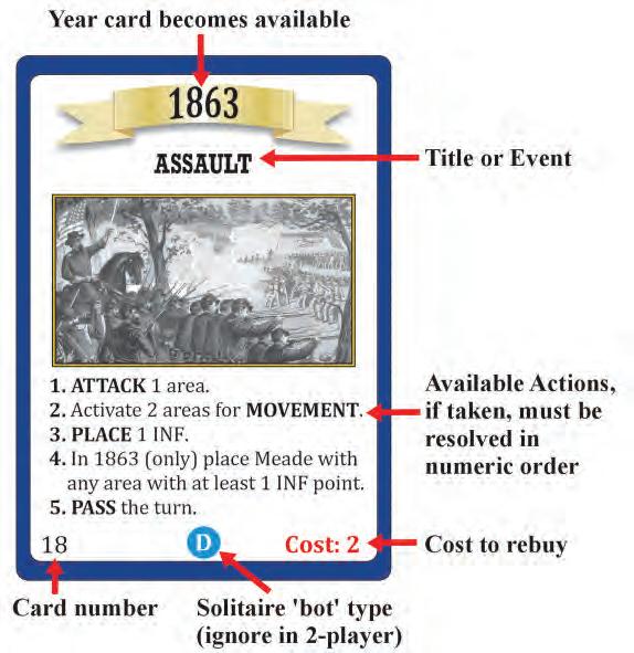 First, display the next Year card or the 1861 card if starting the game (e.g., if 1861 just ended, the next Year would be 1862). Players receive all of their side's action cards (Confederate States & United States) that are marked as available in the new current year, as noted by the banner at the top of the card (see diagram, 6.3). Read the year card. The card will show any special rules for the year. It will also specify who plays first.