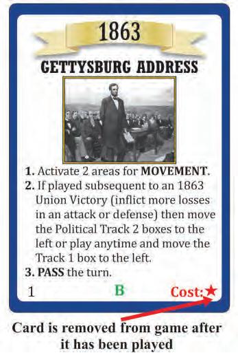 Several cards also affect the Political Track one direction or the other. The cards “Gettysburg Address” and the “Emancipation Proclamation” both shift the political track two boxes to the left, but only if a Union victory occurred