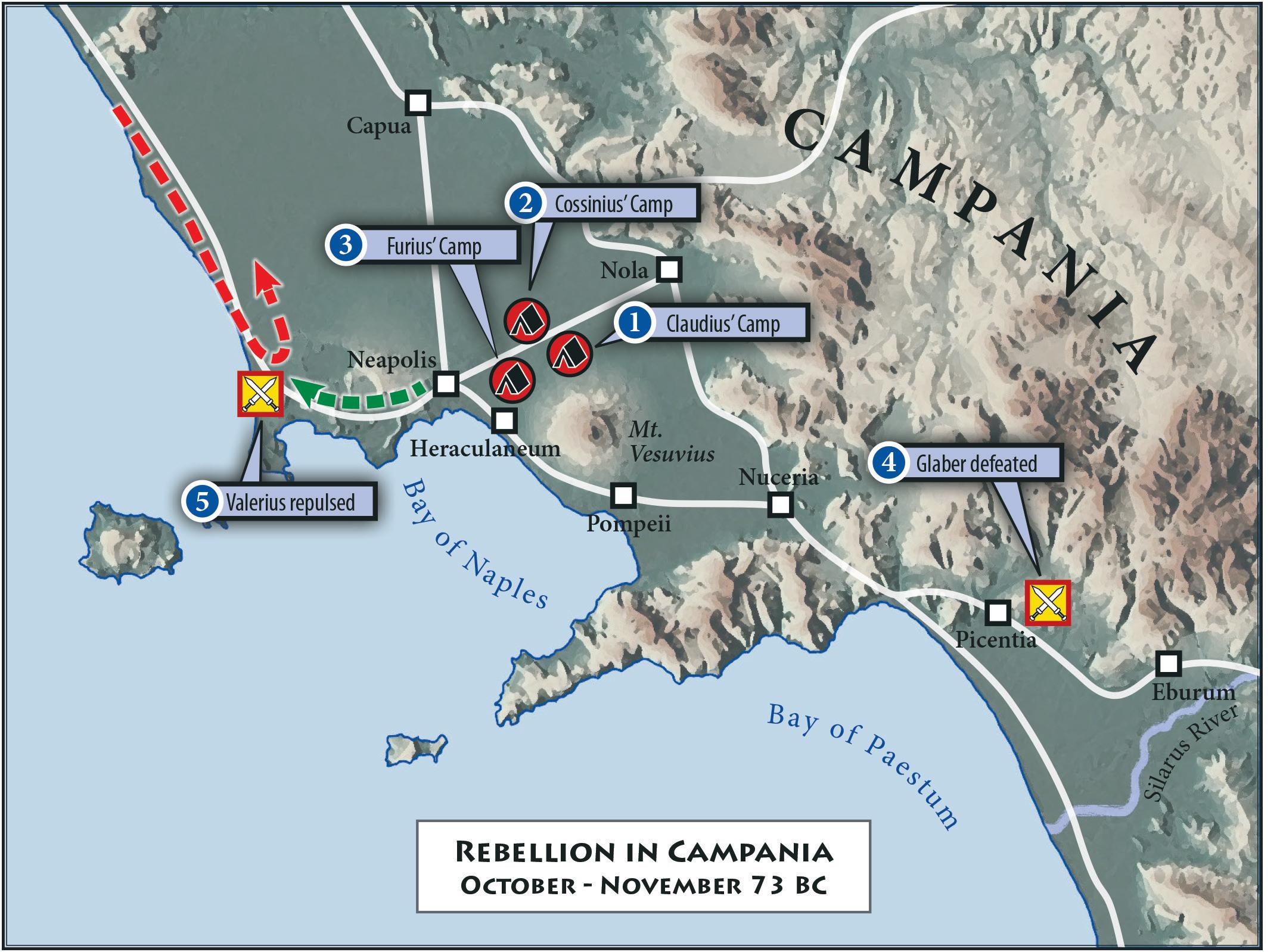 3.5 Rebel Set Up. Place the following Rebel units on the map at the start of the game (all are set up at full strength): Campania -Revolt Marker, Gladiators, five Rebel Slaves, Spartacus, Crixus, Oenomaus.