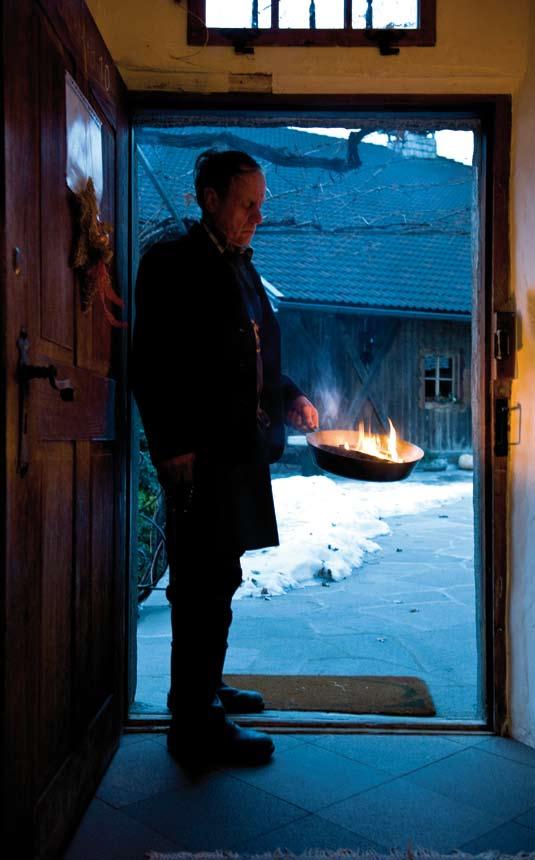 und Hof zum Jahreswechsel, mit Weihrauch und geweihtem Wasser, ist heute vor allem auf die Nacht vor dem Dreikönigsfest beschränkt. „Als wir in St. Oswald noch einen Pfarrer hatten, wurde am Morgen des Dreikönigstages bei einer einfachen kirchlichen Zeremonie das „Kinigwasser“ geweiht. Alle Bauern haben daran teilgenommen und das Wasser dann in einem Behälter mit nach Hause genommen“, erinnert sich Michl. Am Abend dann versammelt sich die ganze Familie in der Stube. Etwas Holzglut aus dem Ofen wird in eine Eisenpfanne gegeben. Darauf streut die Bäuerin oder eines der Kinder den Weihrauch. Diesen haben die Sternsinger bei ihrem Besuch mitgebracht. Nun beginnt die Hausräucherung. Der Bauer geht mit seiner Familie betend durch das Haus, Kästen und Truhen sollten offen stehen. Auch in den Stall zu den Tieren begibt sich die Familie, ist das Vieh für die Menschen auf dem Hof doch von großer Bedeutung. Der Duft des Weihrauchs hängt noch tagelang in den Räumen, der Segen muss für das ganze Jahr gut sein.