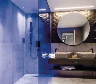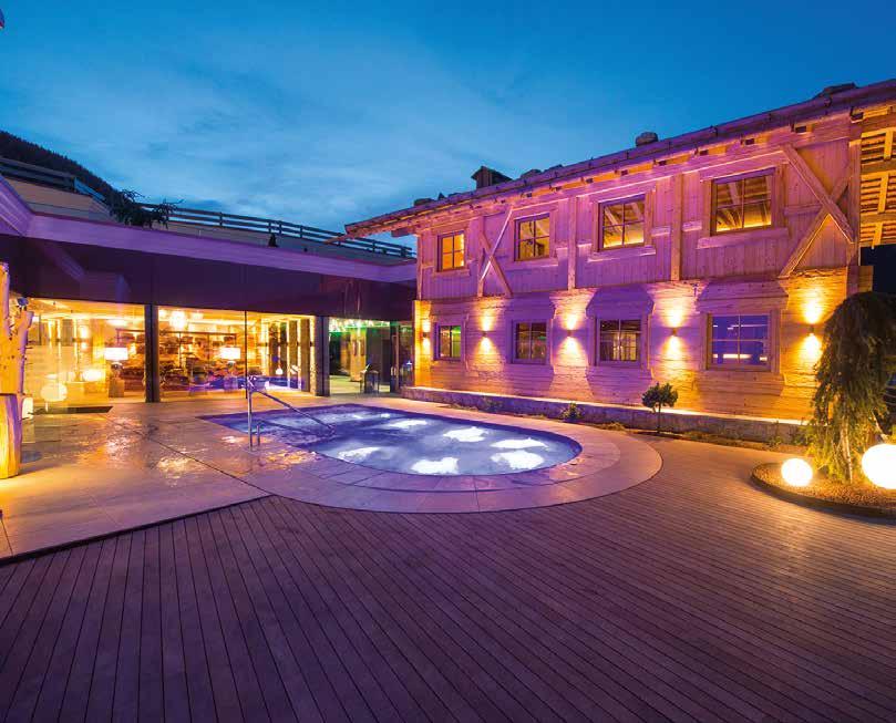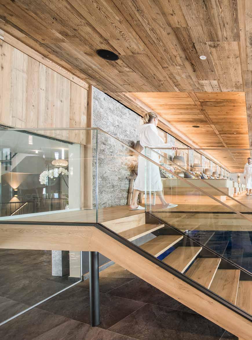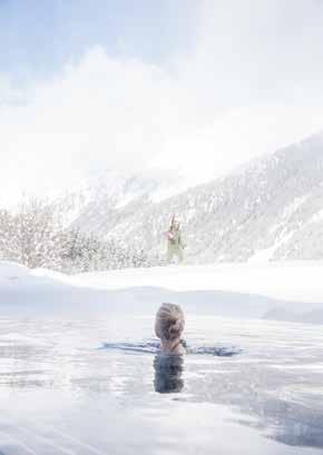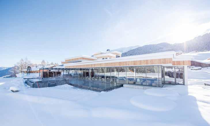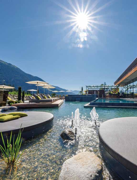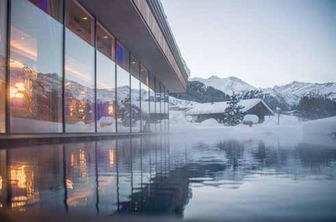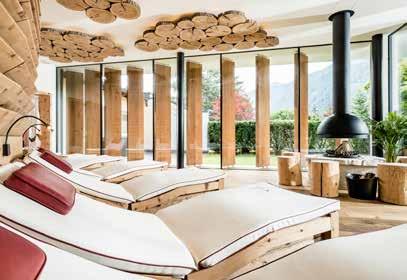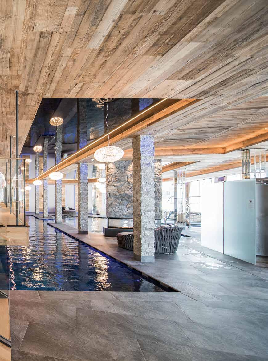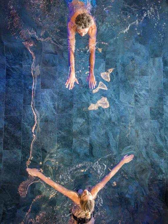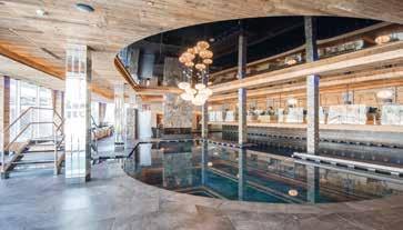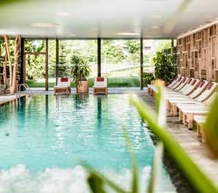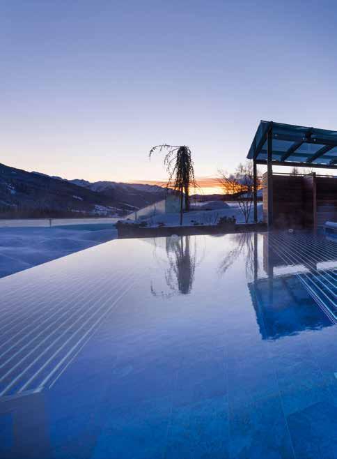 Die Indoor-Wasserwelt verzaubert mit einem 20-MeterBecken, einem Relaxpool, der sich nach außen öffnet und einem Panorama-Ruhebereich. Die Transparenz zwischen innen und außen macht die Natur allgegenwärtig. Dadurch tritt der Alltag in den Hintergrund und lässt Ruhe einkehren.