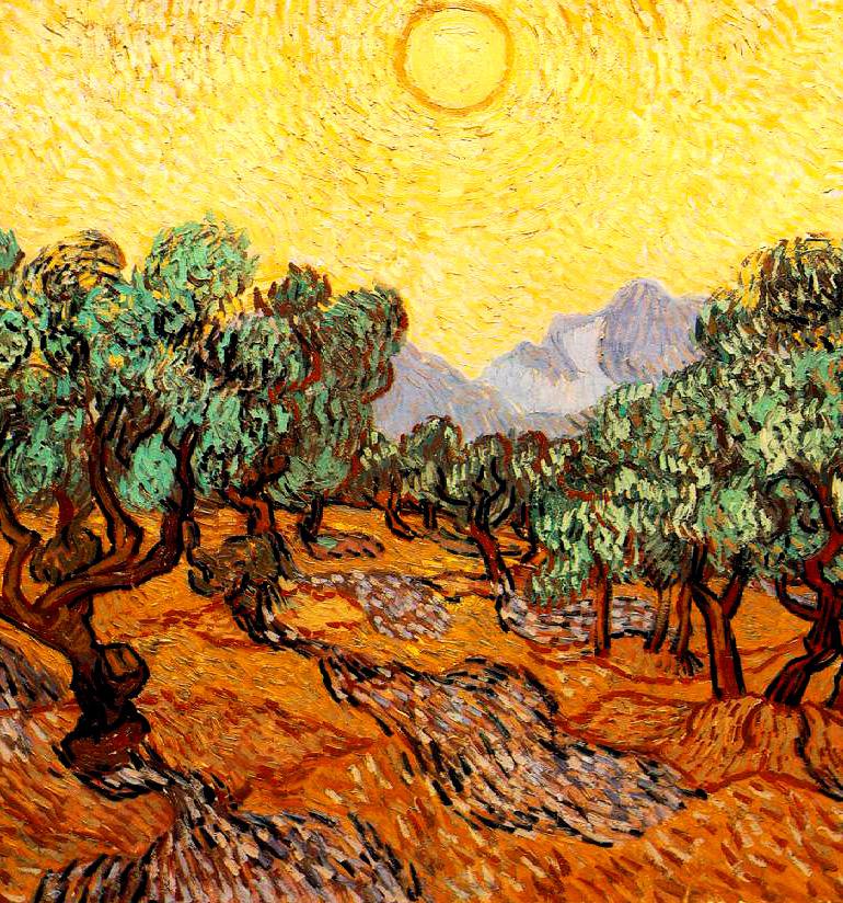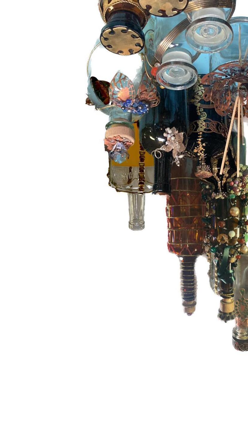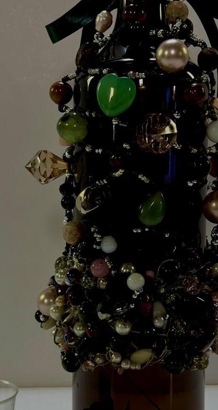 Abbiamo saldato un torsion sul modulo situato sulla pancia della bottiglia. Dalle catenelle, che riprendono il colore del dipinto, pendono delle pietre dai colori terrosi. Il dipinto è ampiamente riconosciuto per le sue pennellate audaci, l’emotività e il forte simbolismo. La composizione del quadro è dinamica, in quanto gli ulivi occupano la parte centrale della tela, mentre il resto dello spazio è occupato dal cielo giallo e dal sole Il progetto nella sua unità, è stato realizzato con materiali di riciclo. Non solo i moduli, ma anche le bottiglie stesse, utilizzate con l’obbiettivo di evitare lo spreco.