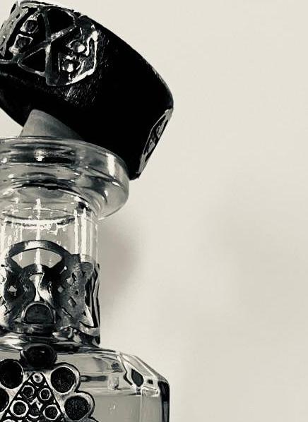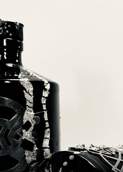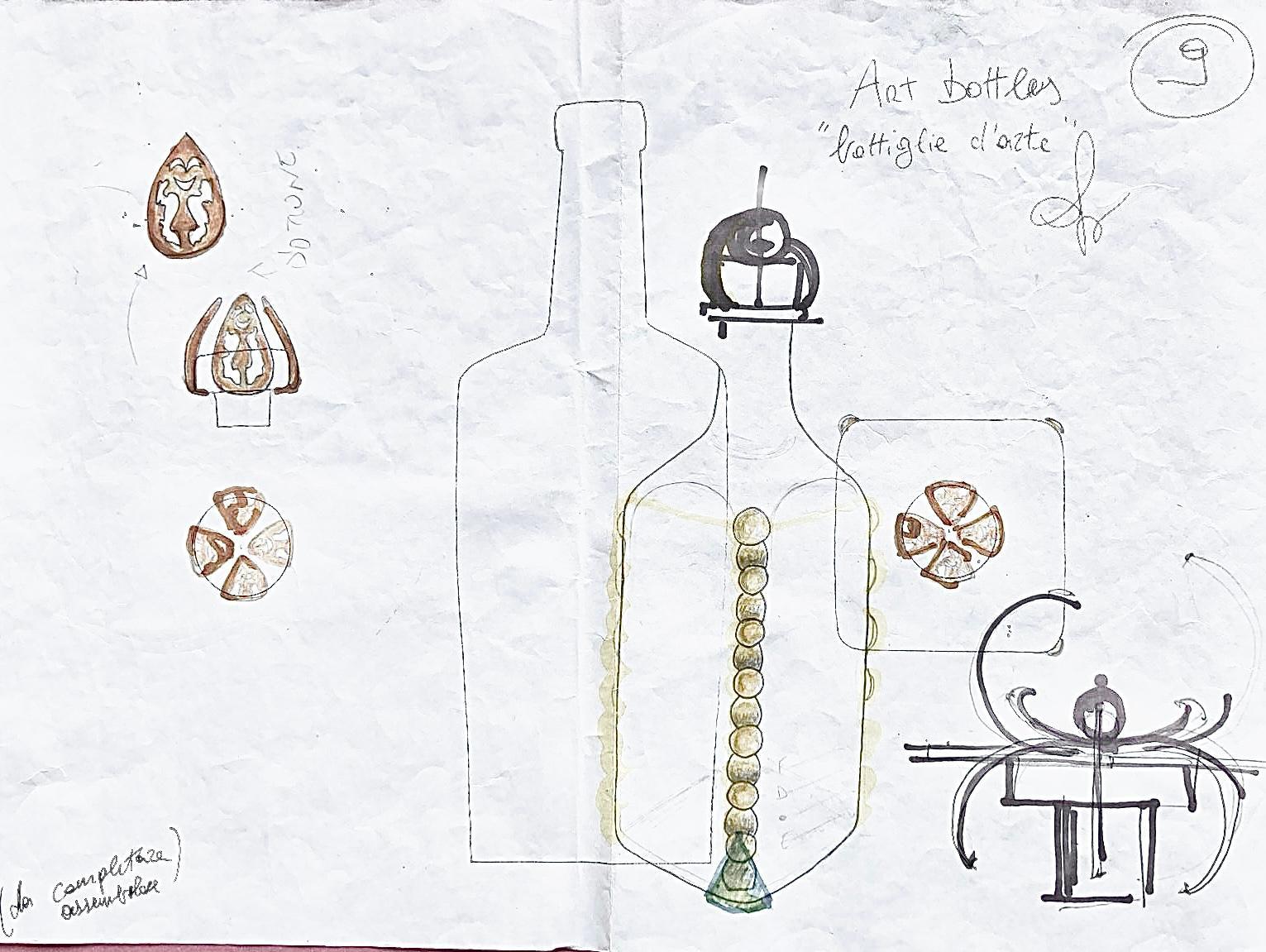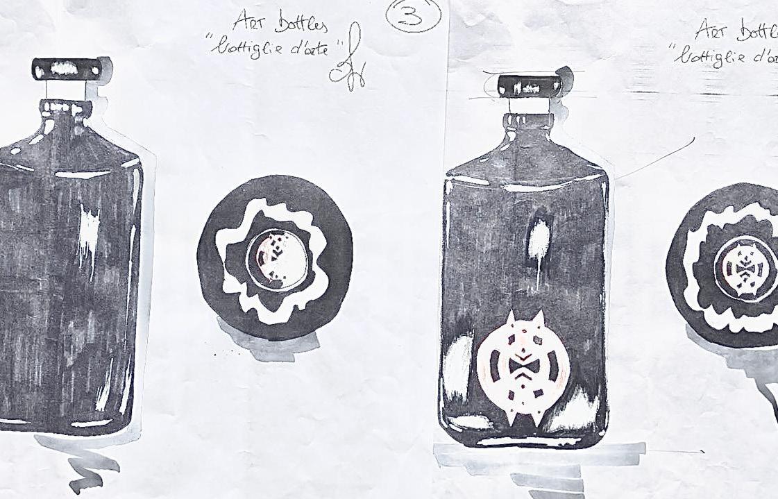 On the bottle was accomplished a fretwork and filing work was carried out. We studied where to insert the semicircles, they reasume the bottle’s peculiarity. The corck was constituded by a silver cap.