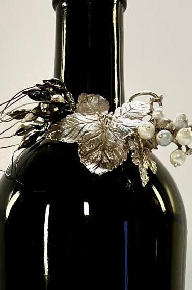 The bottle is characterized by a composition of ears of wheat, leasves and grapes on the base of the neck of the bottles, made of silver. The cap is composed of a silver rigid cover, tunneling techniques have been used.