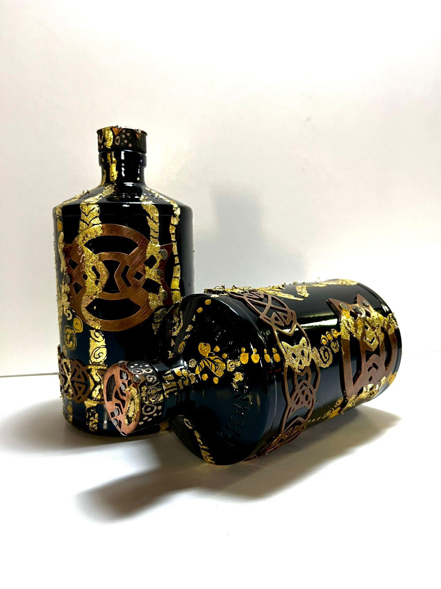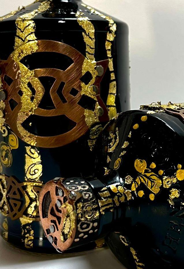 The bottles are characterised by nailed copper geoemtric modules, which are positioned oppositely on both of them. On the side of the cap there is a machining obtained with the cutter, on the surface we find the geometric form in copper, also nailed. To take up the detail of the painting further, gold leaf and gold acrylic decorations have been added. The picture offers the user a natural scenario, represents an invitation to meditation and contemplation. The artist gives life to the composition through the contrast between vertical and horizontal lines, the choice of segments, in addition to reflecting the idea of a higher sense of order that presides over Klimt’s paintings, has the function of creating a stability of perception and the ideal intersection between the vertical lines of the trunks and the horizontal ones of the leaves that have fallen into the undergrowth. Klimt paints beech trunks that give the impression of being slightly swaying; each stem is different from the other in thickness, colour and trend. The presence of neat vertical lines and small horizontal segments evokes the structure of a precious fabric and the painting becomes like a soft cloth. The project in its unit, was made with recycled materials. Not only the modules, but also the bottlesd themselves, used with the aim of avoiding waste.