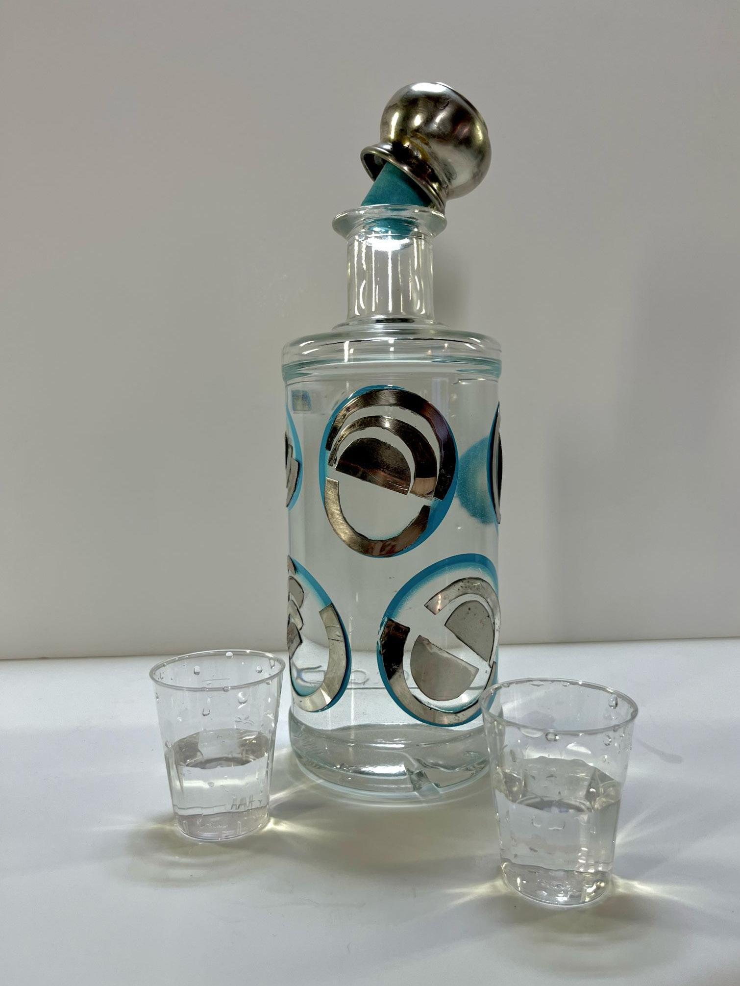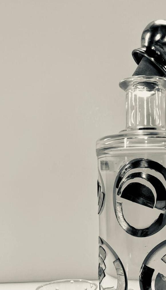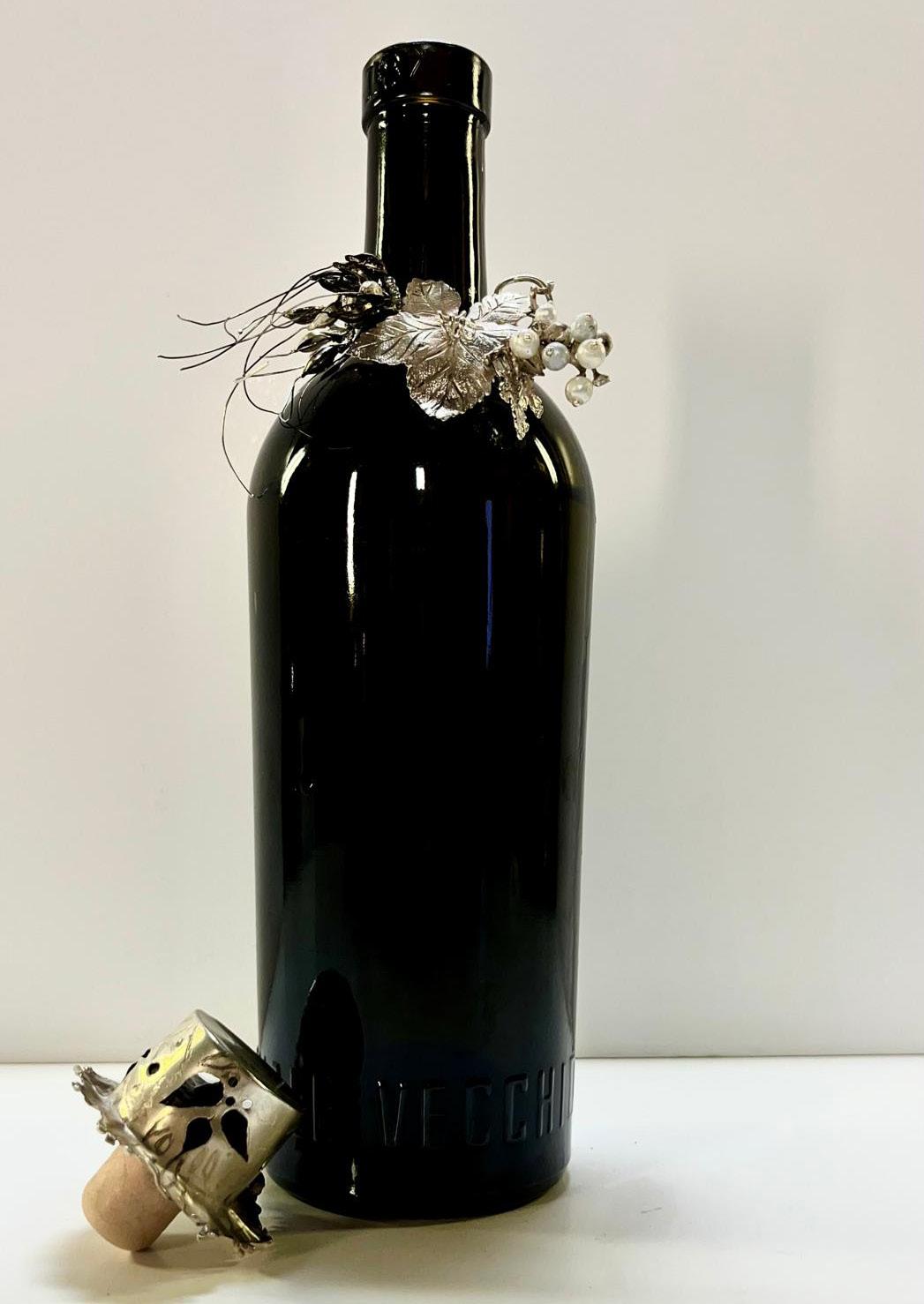 Sulla bottiglia è stato realizzato un lavoro di traforo e limatura. E’ stato studiato dove inserire i semicerchi, che riprendono le peculiarità della bottiglia. Il tappo è costituito da un pomello in argento.