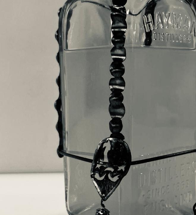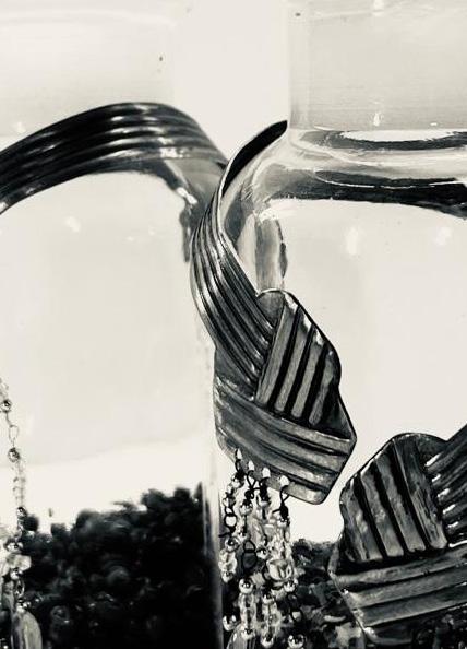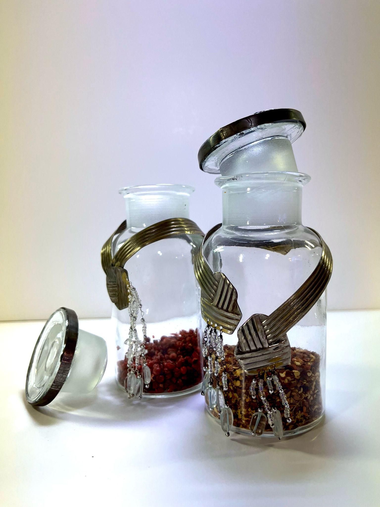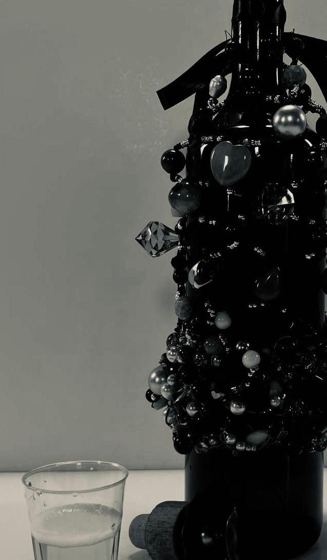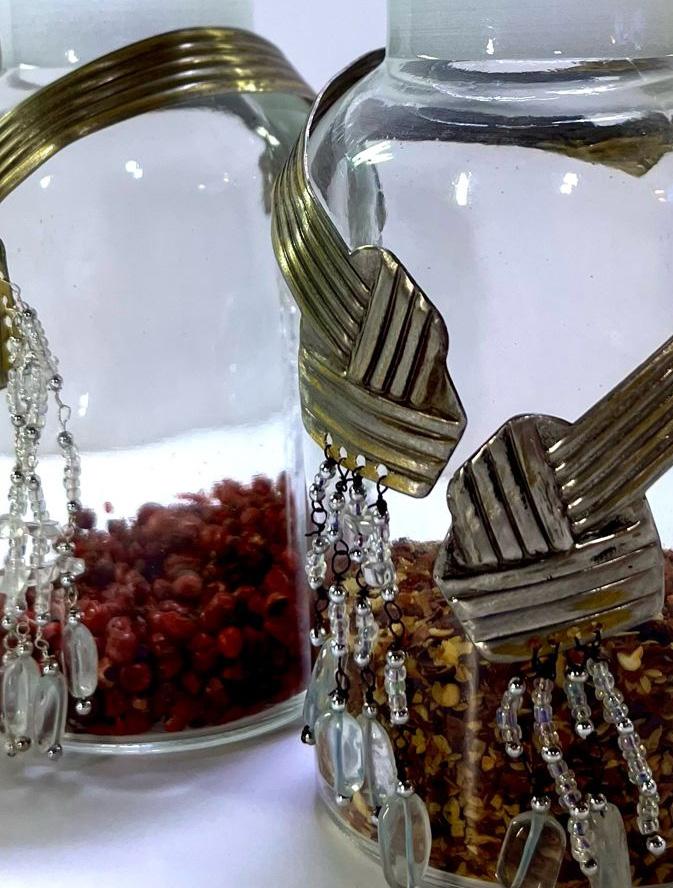 Sulle bottiglie è stato effettuato la tecnica del traforo per la realizzazione del tappo che riprende una forma concentrica, con la stemperazione del metallo abbiamo accentuato la forma tondeggiante della bottiglia. Successivamente con il trapano verticale, sono stati creati dei fori ai quali abbiamo appeso delle pietre bianche.
