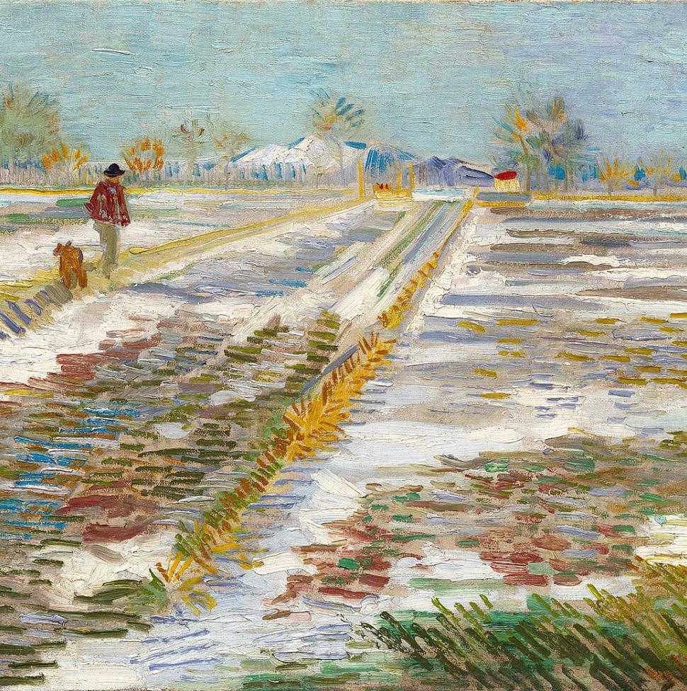 Si tratta di una visione antinaturalistica di quello che è un pease invernale, caratterizzato dall’unione di colori caldi e freddi, sullo sfondo è presente un uomo con un cane che guarda verso le montagne.