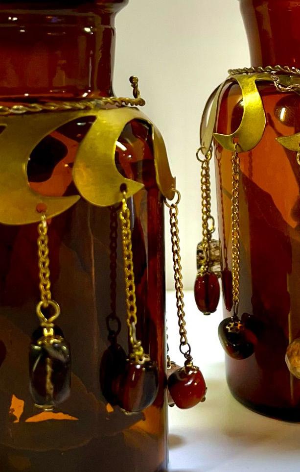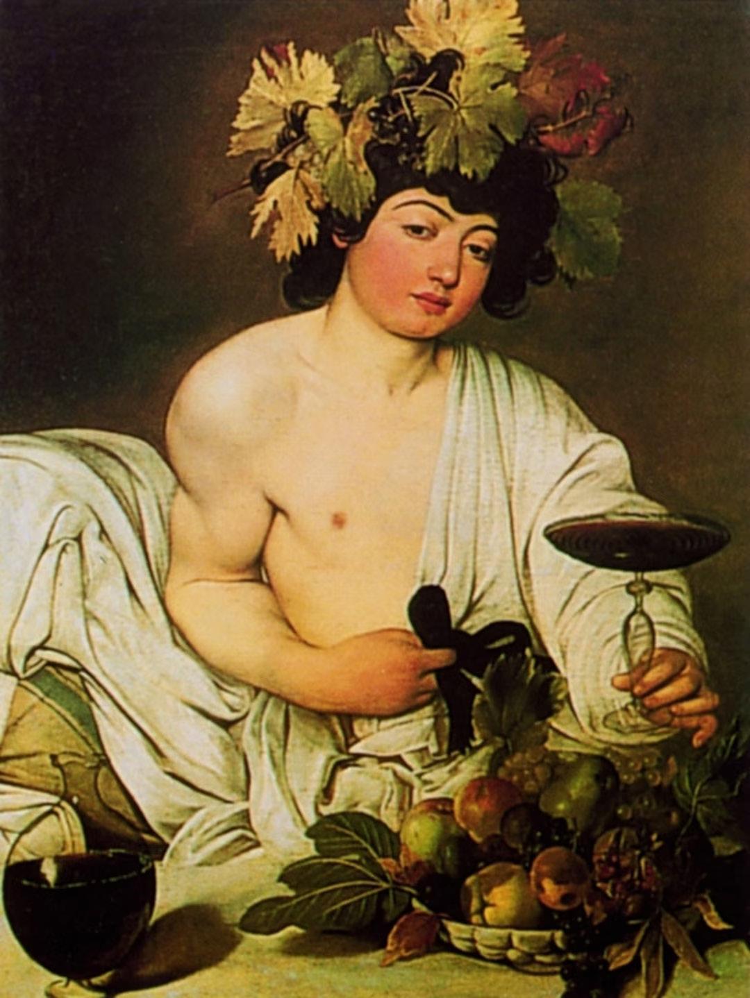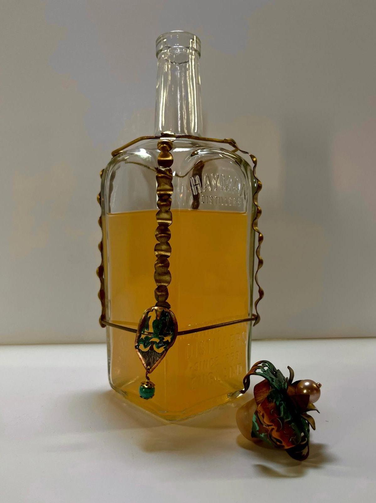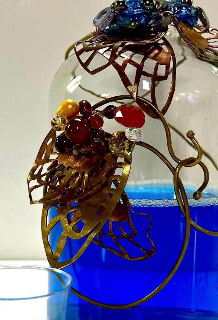 The bottle was made from brass and copper materials. Scrap elements having a leaf-like shape have been used. They were welded on brass wire that wraps around the roundness of the bottle. To embellish we used hiolite stones on top, and stones in warm tones. Finally, two were inserted on the cap : the base made of copper that takes up the idea of the leaves of the Bacchus garland, and a diamondshaped crystal that acts as a pin for the metal structures. Caravaggio in this work depicts the Roman God of wine and harvest. The young man is lying on a sort of improvised triclinium. He is wrapped in a sheet, in imitaion of a roman dress. He has a garland of vine branches strims that ring like a crown lying on bthe curly black hair.