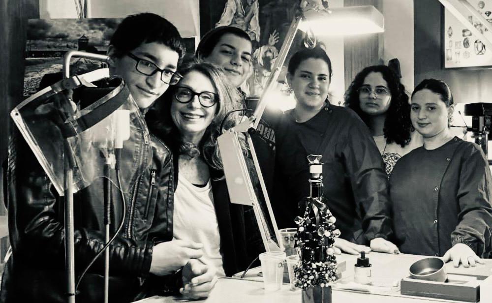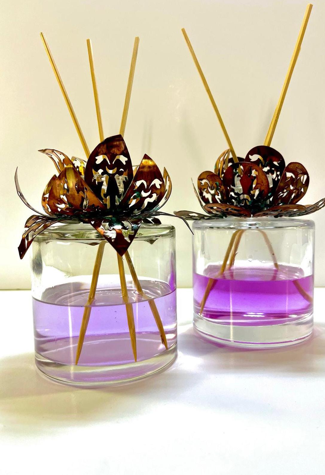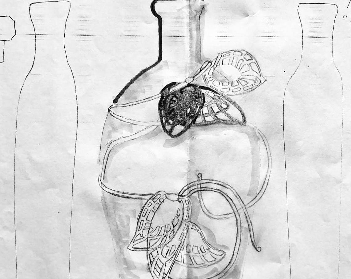 In questo progetto sono state realizzate due bottiglie gemelle, le quali differiscono dalla posizione delle foglie posizionate sulla parte piana della bottiglia. I pezzi sono stati saldati utilizzando la tecnica della colatura del gesso con la cristobalite. Nella parte interna e sottostante, le foglie sfoggiano un blu brillante, dovuto all’applicazione dell’ossidazione tramite acidi. Questo paio di bottiglie hanno lo scopo di contenere profumo.