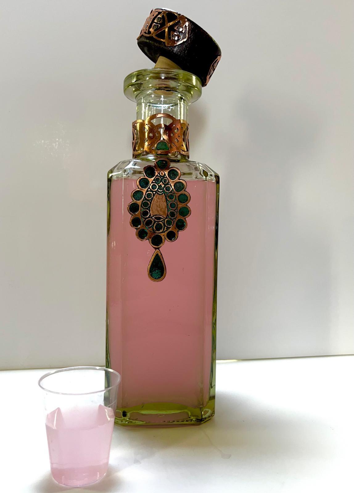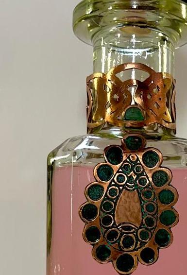 The bottle is characterized by a brass structure that exalt its square shape. The side parts were made with the cantilever technique, on the lower left part a leaf-like shaped form treated with acid oxidations was welded, to which an Arizona torquoise pearl was connected. The cap is characterized by yet another structure that includes the welding of four copper leaves, also treated with acid oxidation. In the centre was placed a reduced brass flower stopped by a pink pearl on log base.
