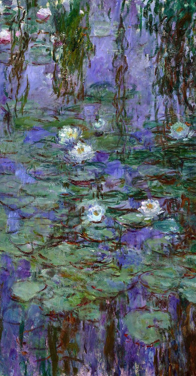 Le Ninfee fanno parte di una serie di circa 250. Hanno abbandonato la costrizione della forma, il cielo scompare e vi trovano solo i fiori con i medesimi riflessi sull’acqua.