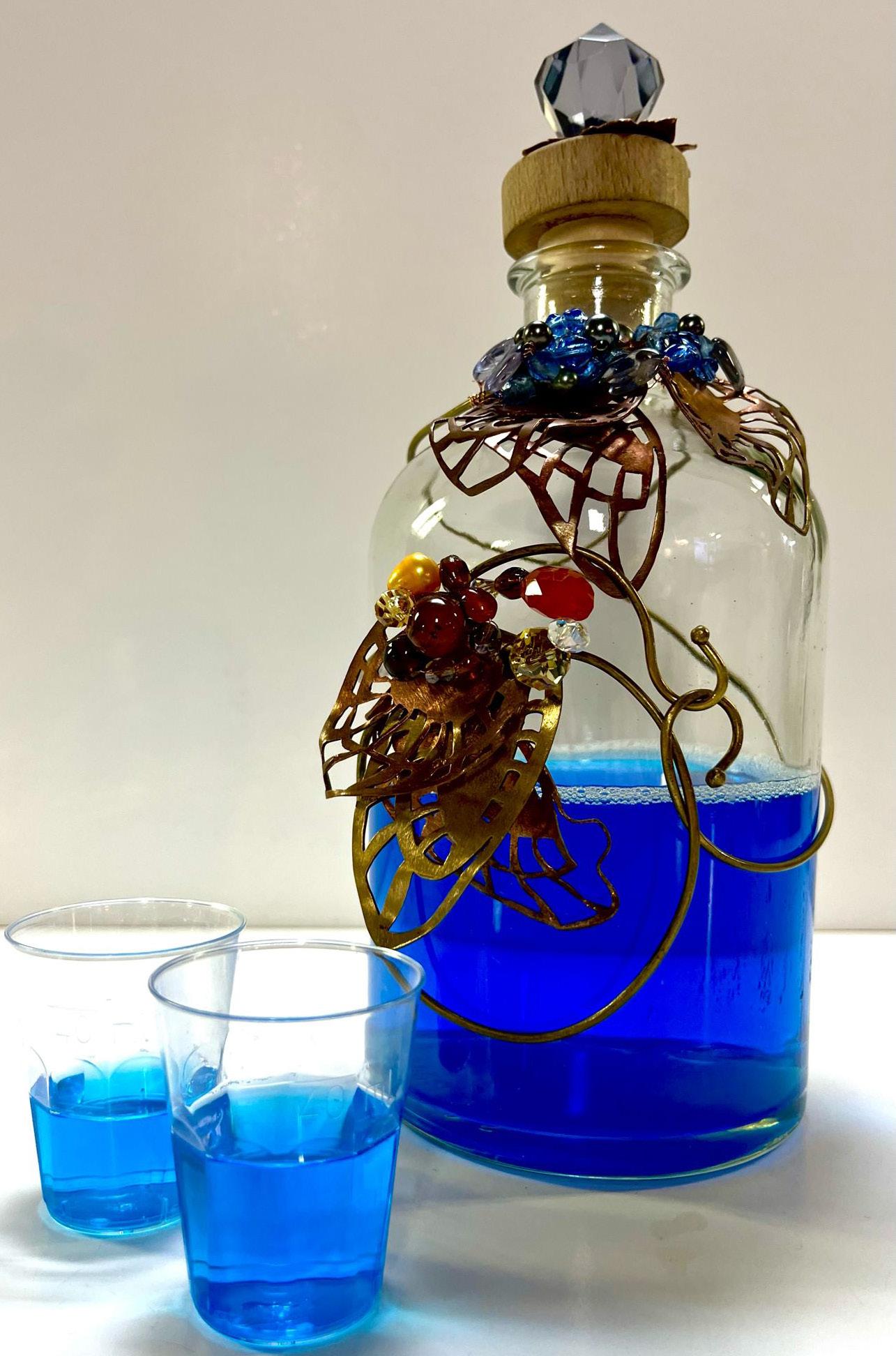 The bottle itself was made with a torchon, to which different types of stones were connected. The torchon net reaches up to the neck of the bottle, and the whole thing ends with a green ribbon. A shell-shaped module was applied to the cap and a white pearl was placed inside.