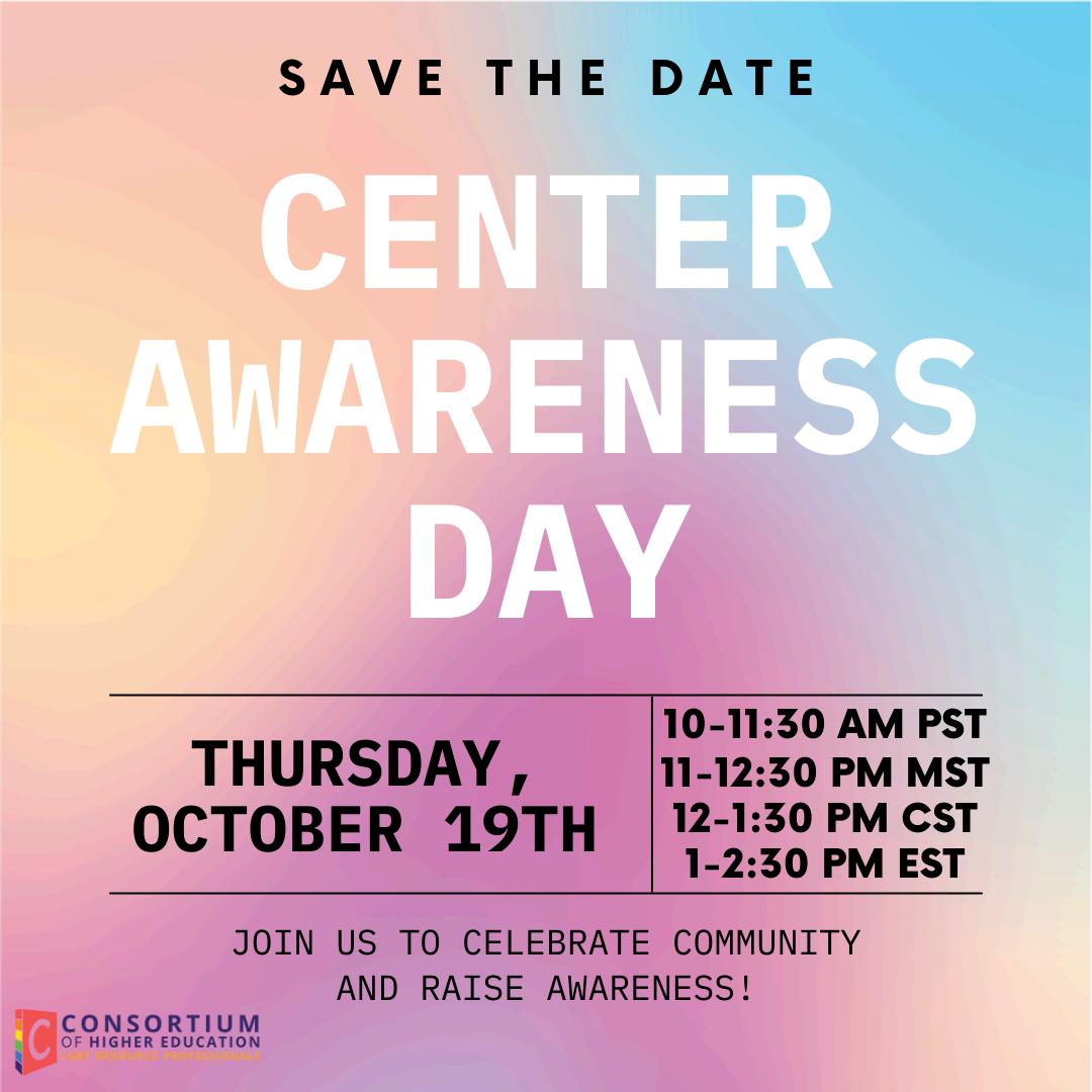 In October 2023, we held our annual Center Awareness Day Webinar Center Awareness Day is celebrated annually on October 19th to honor, appreciate, bring awareness to, and call for the support of LGBTQ+ Resource Centers across the country This year, in light of the sociopolitical climate, our theme centered on the closures of LGBTQ+ resource centers, and highlighted the work that we must do to continue supporting resource professionals and students both in states with such legislation and without
