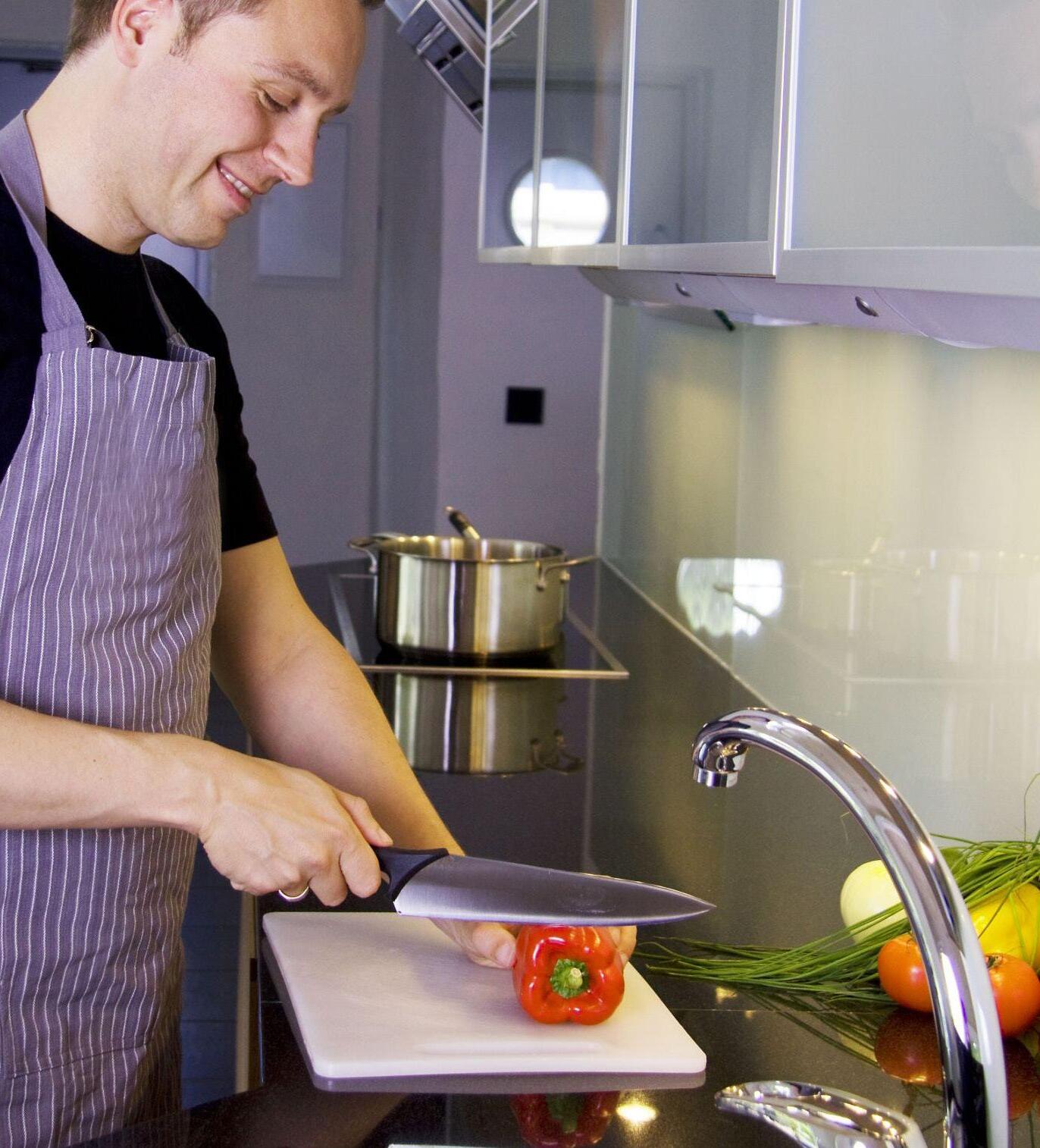 Tack vare den diagonalformade rörelsen blir väggskåpet mycket lätt tillgängligt från sittande position, även i kök där underliggande arbetsyta inte är knäfri.