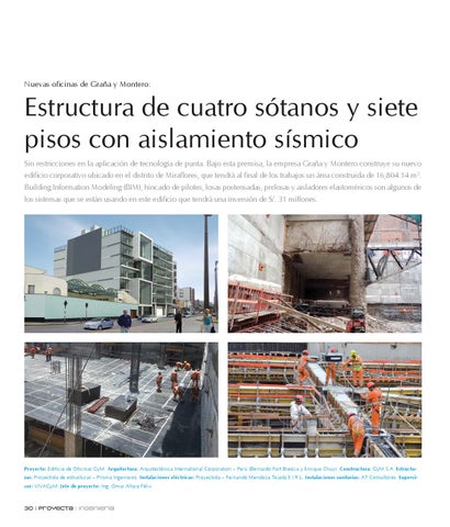 Estructura de cuatro sótanos y siete pisos con aislamiento sísmico Sin restricciones en la aplicación de tecnología de punta. Bajo esta premisa, la empresa Graña y Montero construye su nuevo edificio corporativo ubicado en el distrito de Miraflores, que tendrá al final de los trabajos un área construida de 16,804.14 m2. Building Information Modeling (BIM), hincado de pilotes, losas postensadas, prelosas y aisladores elastoméricos son algunos de los sistemas que se están usando en este edificio que tendrá una inversión de S/. 31 millones.