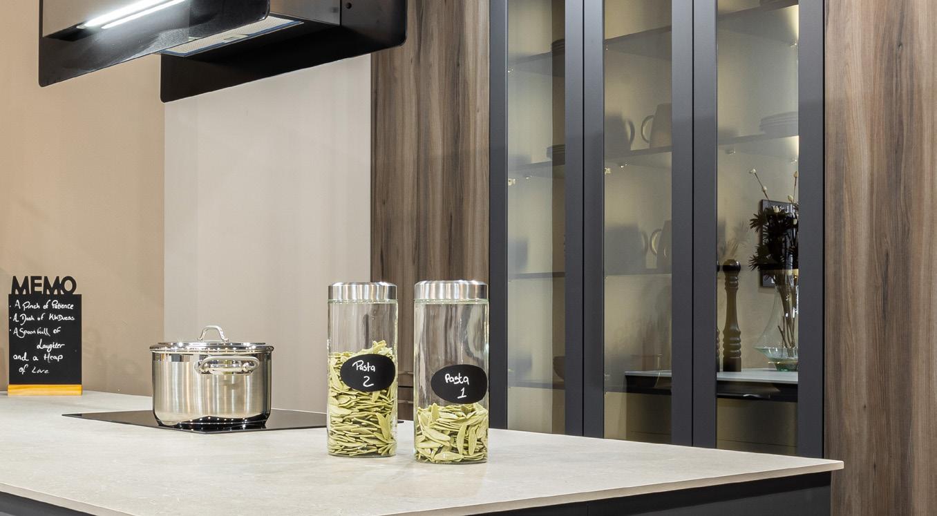 A thourough combination of elements featuring cambridge and pera woodgrains together with matt black, grey, clay grey, cashmere and latte colours paired with empira black ceramic worktop gives our Kafir kitchen its distinct signature.