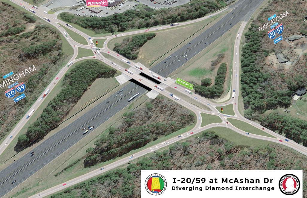 The Alabama Department of Transportation (ALDOT) has begun construction on Jefferson County’s first diverging diamond interchange (DDI) at Exit 104 on Interstate 20/59 and McAshan Drive in the town of McCalla, southeast of Birmingham, a $22 million project to accommodate rising traffic due to increased local economic development.