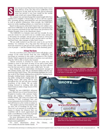 A Crane That Cares Over the next three years, John Sutch Cranes will pledge a percentage of the rental income from the new GMK5200-1 and encourage its customers to also make a donation to The Christie Charity, which supports the provision of services over and above what the NHS is able to fund at the hospital. “Almost everyone is touched by cancer in some way and Christies is close to the heart of many of our staff at John Sutch Cranes. Like many charities, its usual income has been affected over the last year and we want to give a little back,” he said. Anna McIntosh, major relationships development manager at The Christie Charity, said, “We are absolutely thrilled with the support from John Sutch Cranes. This advertising highlights the everyday work of The Christie, talking about saving lives, making breakthroughs, holding hands, wiping tears, lifting spirits, raising funds, ringing bells and beating cancer. This crane will be seen throughout the UK and will raise essential awareness of the charity. We are really looking forward to working with John Sutch Cranes to make a huge success of this opportunity.” Fittingly, the new GMK5200-1 all-terrain crane’s first job was at Great Ormond Street Hospital in London, with customer Clarke Energy also making a donation to The Christie Charity. The crane was tasked with removing a CHP (combined heat and power) generator for its 60,000 hour service and will return in a few weeks to replace it. “The uptake so far has been fantastic and we have lots of bookings for the crane. There isn’t a set amount we would like customers to donate but whatever they can contribute will be much appreciated and make a real difference to the lives of people in our community,” Parry concluded. For more information about the Grove GMK5200-1 all-terrain crane, visit www.manitowoc.com/grove/allterrain-cranes/gmk5200-1. For more information about The Christie, visit www.christie.nhs.uk/the-christie-charity.