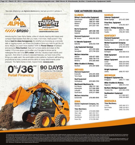 **For For ccommercial ommercial uuse se oonly. nly. CCustomer ustomer pparticipation ar ticipation ssubject ubject ttoo ccredit redit qqualification ualification aand nd aapproval pproval bbyy CCNH N H CCapital apital AAmerica merica LLLC. LC. SSee ee yyour our CCase ase ddealer ealer ffor or ddetails etails aand nd eeligibility ligibilit y rrequirements. equirements. DDown own ppayment ay men t m may ay bbee rrequired. equired. OOffer f fer ggood ood tthrough hr o ugh M March arch 331, 1, 22011 011 aatt pparticipating ar ticipating CCase ase ddealers. ealers. NNot ot aallll ccustomers ustomers oorr aapplicants p p li c a n t s m may ay qqualify. ualif y. CCNH N H CCapital apital AAmerica merica LLLC LC sstandard tandard tterms er ms aand nd cconditions onditions wwillill aapply. pply. TThis his ttransaction ransaction wwillill bbee uunconditionally nconditionally iinterest nterest ffree. ree. EExample xample - 00.00% .0 0% pper er aannum nnum ffor or 3366 m months: onths: BBased ased oonn a rretail etail ccontract ontract ddate ate ooff JJanuary anuar y 11,, 22011 011 wwith ith a ssuggested uggested rretail etail pprice rice oonn a nnew ew SSR220 R 220 ooff $$41,905.00, 41,9 05.0 0, ccustomer ustomer pprovides rovides ddown own ppayment ayment ooff $$5,941.00 5,9 41.0 0 aand nd fifinances nances tthe he bbalance alance ooff $$35,964.00 35,9 6 4.0 0 aatt 00.00% .0 0% pper er aannum nnum ffor or 3366 m months. onths. TThere here wwillill bbee 3366 eequal qua l m monthly onthly iinstallment nstallment ppayments ayments ooff $$999.00 9 9 9.0 0 eeach. ach. TThe he ttotal otal aamount mount ppayable ayable wwillill bbee $$41,905.00, 41,9 05.0 0, wwhich hich iincludes ncludes fifinance nance ccharges harges ooff $$0.00. 0.0 0. TTa Taxes, a xes, ffreight, reight, sset-up, et-up, ddelivery, eliver y, aadditional dditional ooptions ptions oorr aattachments t tachments nnot ot iincluded ncluded iinn ssuggested uggested rretail etail pprice. rice. OOffer f fer ssubject ubject ttoo cchange hange oorr ccancellation ancellation wwithout ithout nnotice. o t i c e. ***For *For ccommercial ommercial uuse se oonly nly – nnot ot iintended ntended ffor or ppersonal, ersonal, ffamily amily oorr hhousehold ousehold uuse. se. TThis his ooffer f fer aapplies pplies ttoo qqualifying ualif ying ppurchases urchases ooff $$750 750 oorr m more ore ooff ggenuine enuine CCase ase pparts ar ts aand nd rrelated elated sservices er v ic e s m made ade uusing sing tthe he CCNH N H CCapital apital CCommercial ommercial RRevolving evolving AAccount ccount ((the the ““Account”) Account” ) dduring uring a ssingle ingle vvisit isit ttoo a pparticipating ar ticipating CCase ase ddealership ealership llocated ocated iinn tthe he UUnited nited SStates tates nnow ow tthrough hr o ugh M March arch 331, 1, 22011. 011. IIff aany ny ppayment ayment wwhen hen ddue ue iiss nnot ot m made ade oonn bbalances alances ooutstanding utstanding uunder nder tthe he AAccount, ccount, tthe he ppromotional romotional tterms er ms m may ay bbee tterminated erminated aand nd tthe he ppromotional romotional bbalance alance wwillill bbee ssubject ubject ttoo tthe he aapplicable pplicable ddefault efault rrate ate pprior rior ttoo tthe he eexpiration xpiration ooff tthe he ppromotional romotional pperiod. eriod. OOnce nce tthe he ppromotional romotional pperiod eriod eexpires xpires oorr iiss tterminated, e r min a t e d, m minimum in im um m monthly onthly ppayments ayments wwillill bbee rrequired equired aand nd fifinance nance ccharges harges wwillill bbegin egin ttoo aaccrue ccrue aand nd CCNH N H CCapital apital AAmerica merica LLLC LC sstandard tandard tterms erms aand nd cconditions onditions wwillill aapply. pply. CCustomer ustomer pparticipation ar ticipation ssubject ubject ttoo ccredit redit qqualification, ualification, aavailable vailable ccredit redit aand nd ggood ood sstanding tanding oonn aallll CCNH N H CCapital apital aaccounts. ccounts. NNot ot aallll ccustomers us t omer s m may ay qqualify ualif y ffor or tthis his rrate ate oorr tterm. erm. PProgram rogram ssubject ubject ttoo cchange hange oorr ccancellation ancellation wwithout ithout nnotice. o t i c e. © 22011 011 CCNH N H AAmerica merica LLLC. LC. AAllll rrights ights rreserved. eser ved. CCase ase iiss a rregistered egistered ttrademark rademark of of CNH CN H AAmerica merica LLLC. L C.