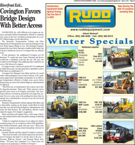 www.ruddequipment.com COVINGTON, Ky. (AP) Officials in Covington are trying to persuade federal transportation officials to maintain easy access to the city’s riverfront in design plans for a new $2.3 billion bridge over the Ohio River. The Kentucky Transportation Cabinet and Ohio Department of Transportation have narrowed designs for the new Brent Spence Bridge to two. The Kentucky Enquirer reported the more likely alternative handles traffic better, but it doesn’t include the access to Covington that city officials want. In that alternative, the southbound Covington exit off Interstate 75 would start near Union Terminal and drivers would take a distributor road into the city. The next exit would be in Fort Wright. The northbound side would have an exit at 12th Street in Covington. Covington wants a main access point off I-75 southbound at Ninth Street and a second ramp from a distributor road to Fifth Street on northbound I-75. Covington City Manager Larry Klein said the city would suffer without adequate access to the riverfront, so he’s gathering support from surrounding communities in an effort to get transportation officials to include more access before design plans are sent to the Federal Highway Administration for approval. “The FHA role, as I understand it, they want to move traffic along the interstate,” Klein said. “Their mission is not to provide good access to Covington, necessarily. Our riverfront economy was built up around the exit ramps they created. For us to come away with anything less than what we already have will diminish it, not just for our city, but for all riverfront cities.” Kentucky Transportation Cabinet engineer Rob Hans said a final public meeting on the design would likely be held later this year, but the Federal Highway Administration will make the final decision. He said highway officials would study the impact of Covington’s suggestions. Klein said letters and support from a wide range of leaders and residents before and at the public meeting would help the effort. “I think it is important, because we are asking for what is essential going to be an exception to these FHA guidelines, that Northern Kentucky speak with one voice,” Klein said. “That is our purpose going around and getting everyone on the same page.” Newport officials said they shared Covington’s concerns. “The closer the traffic exits off the expressway into downtown Covington, the better it is for the cities to the east — Newport, Bellevue, Dayton,” said Newport Mayor Jerry Peluso. “We know how important 75 is. Those extra two ramps you are proposing is a lifeline to Newport.”