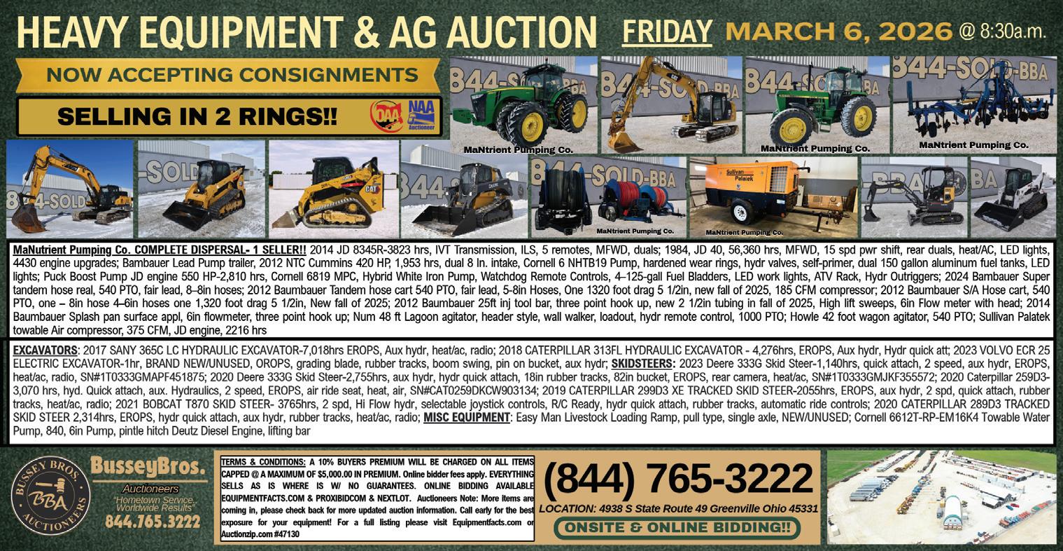 Days 1-5 featured tools, generators, mini-excavators, trailers, boom and scissor lifts, a variety of attachments and more. Days 6-10 included a wide selection of equipment for the Ag, forestry, construction, recycling, aggregate, paving, utility and concrete industries, with tractors, excavators, skid steers, log skidders, loaders, service trucks, drilling equipment, pavers,