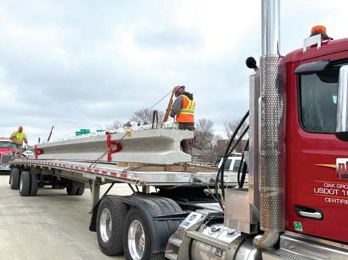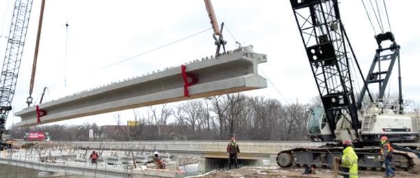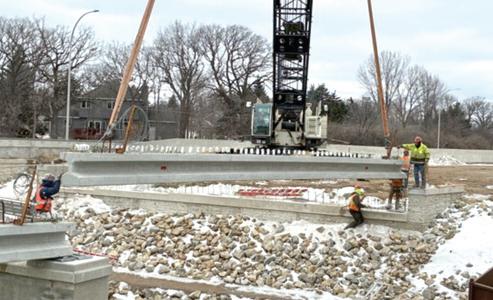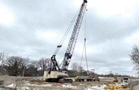A crane prepares to lift beams from the truck on the west side of Cedar