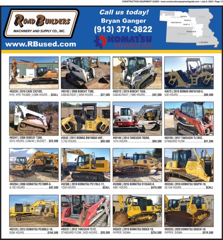 Page 2 • July 8, 2023 • www.constructionequipmentguide.com • CONSTRUCTION EQUIPMENT GUIDE 2008 CAT 324DLH | $75,000 SN: JJG01038 | Hours: 11,722 2017 CAT 336F | $129,500 SN: RKB10217 | Hours: 9,135 2018 CAT 323-07 | $142,000 SN: RAZ00889 | Hours: 5,445 2018 CAT 289D C3H2 | $50,000 SN: TAW08896 | Hours: 3,557 2007 CAT 236B2 | $26,000 SN: HEN06823 | Hours: 1,977 2016 CAT 289D C3H3 | $57,000 SN: TAW05714 | Hours: 2,411 2003 CAT 953C | $52,000 SN: 2ZN05653 | Hours: 12,629 2003 CAT 963C | $119,000 SN: BBD02757 | Hours: 9,625 1998 CAT 928G | $38,000 SN: 6XR00789 | Hours: 11,594 36 LOCATIONS ACROSS MO, IL, WI & MI 636.384.4021