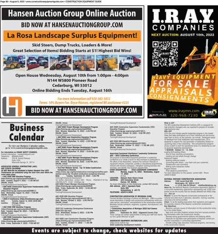 Business Calendar To view our Business Calendar online, go to www.constructionequipmentguide.com. For information on CRANE SAFETY COURSES: Contact Information: cranesafe@gmail.com Telephone: 800/654-5640 Address: 224 W. Central Parkway Suite 1024 Altamonte Springs, FL 32714 ASSOCIATED GENERAL CONTRACTORS (AGC) AGC EVENTS CALENDAR: All AGC Web-Eds are scheduled in Eastern Standard Time (EST) Conferences are scheduled using the local time zone where the event takes place. • AGC EDGE BIM Education Program https://training.agc.org/course/vbim220801/) Date: Tuesday, August 9, 2022 – 11:00 AM EST ONLINE, Virtual Training/Professional Development • AGC EDGE Construction Supervision Fundamentals (CSF) Education Program (https://training.agc.org/course/vcsf220801/) Date: Wednesday, August 10, 2022 – 9:00 AM ONLINE, Virtual Training/Professional Development • 2022 IT Conference (https://itconference.agc.org/) Date: Tuesday, August 16, 2022 (8:00 AM) Location: Chicago, Illinois Technology • AGC EDGE BIM Education Program (https://training.agc.org/course/vbim220802/) Date: Tuesday, August 30, 2022 – 1:00 PM EST ONLINE, Virtual Training/Professional Development • AGC EDGE Construction Supervision Fundamentals (CSF) Education Program (https://training.agc.org/course/vcsf220901/) Date: Friday, September 9, 2022 – 9:00 AM EST