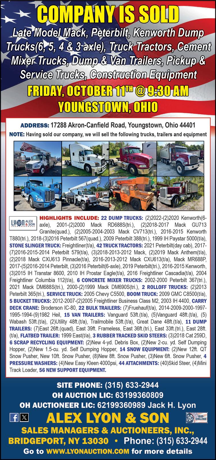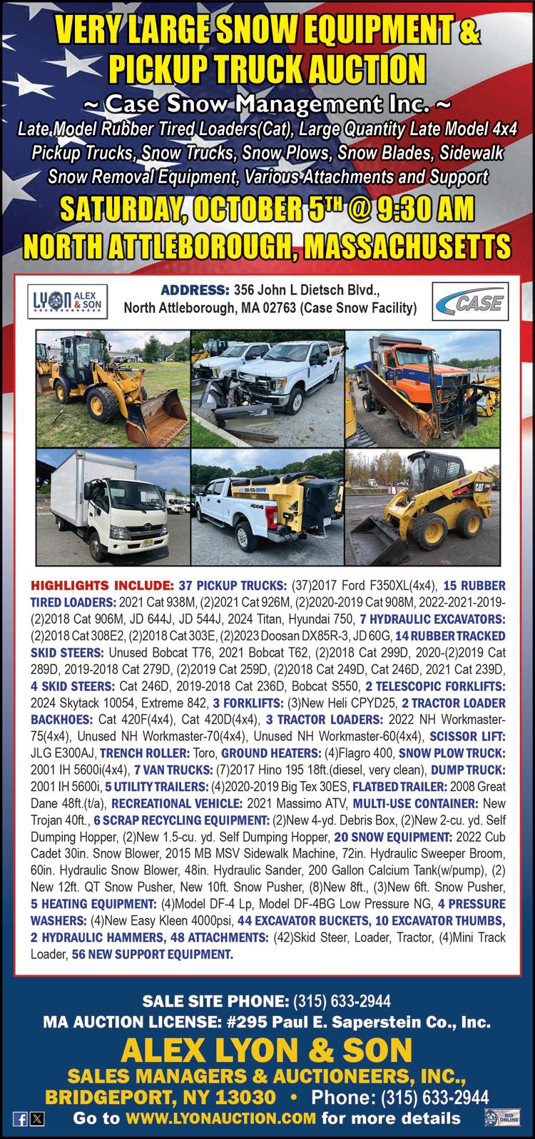 Real Estate LIVE ON SITE (Subject To Owner’s Immediate Confirmation) Wed., October 23, 2024 – 10:00AM Major Equipment VIRTUAL, LIVE Broadcast Wed., October 30, 2024 – 9:00AM Parts Inventory and Support Equipment VIRTUAL TIMED EVENT Thurs., October 31, 2024