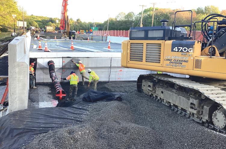 This photo depicts backfilling between the new retaining wall and wingwall on the south end of the new northbound Tower Hill Road Bridge. Crews transitioned from multiple fill types with peastone directly at the backwalls, then reinforced stone backfill under the approach slabs, then pervious fill up to the existing abutment that remains in place.