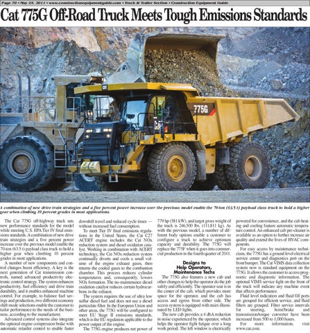 779 hp (581 kW), and target gross weight of the truck is 246,500 lbs. (111,811 kg). As with the previous model, a number of different body options enable a customer to configure a truck to achieve optimum capacity and durability. The 775G will replace the 775F when it goes into commercial production in the fourth quarter of 2011. Designs to Help Operators, Maintenance Techs The 775G also features a new cab and other changes to help the operator do the job safely and efficiently. The operator seat is in the center of the cab, which provides more space for the operator, and the cab has access and egress from either side. The access system is equipped with stairs illuminated by LED lights. The new cab provides a 4 dbA reduction in noise experienced by the operator, which helps the operator fight fatigue over a long work period. The left window is electrically