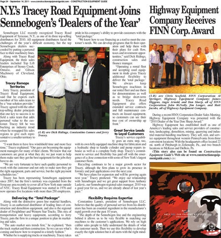 Tracey Remaps Territories Jerry Tracey, president of Tracey Road Equipment, said that he expects each member of his sales team to be a “true solution provider.” Tracey agreed with the other top-selling dealer principals that one key to success is to field a sales team that adds personal value to the customer. Tracey felt he was bucking an industry trend when he remapped his sales (L-R) are Dick Ridings, Constantino Lannes and Jerry Great Service Leads regions to give each repre- Tracey. to Loyal Customers sentative a smaller territory to Tracey’s service capabilicover. ty goes an extra step, too, “I want them to have less windshield time and more face with its own fully equipped machine shop for fabrication and time,” Tracey explained. “Our guys are becoming the equip- a hydraulic shop to handle cylinder and pump repairs inment managers for many of their clients. We know that our house as well as a complete body shop. Tracey’s commitcustomers are great at what they do; we just want to help ment to service and flexibility has paid off with the emerthem make sure they get the best equipment for the jobs they gence of a close connection with some of New York’s largest have to do. customer fleets. “We are very fortunate to have such quality personnel to Recycling continues to be a major growth sector for work with the customer and not only to make sure they get Tracey, although the firm plans to grow its presence in the right equipment, parts and service, but the right payment forestry and port applications over the next year. schedules too.” “We have plans for expansion and will be growing again Tracey has been representing Sennebogen equipment next year,” Tracey predicted. “We enjoy our relationship since 2007, but the firm’s territory was expanded from the with Sennebogen and we get great support from Anthony Syracuse area recently to cover all of New York state outside Laslavic, our Sennebogen regional sales manager. 2010 was of NYC. Tracey Road Equipment was started in 1976 and a good year for us, and we are already ahead of last year’s now operates five locations with more than 250 employees. pace.” Delivering the “Total Package” Along with the distinctive green line material handlers, Tracey is an authorized distributor of leading lines of construction and demolition equipment, and also is the regional dealer of Freightliner and Western Star Trucks. This mix of transportation and heavy equipment, according to Jerry Tracey, puts the firm in a unique position to plan its marketing and sales. “The auto market sees trends first,” he explained, “then the truck market and then construction. So we can see what’s coming and know how to respond in a timely fashion.” Whether he is supplying trucks or machinery, Tracey takes