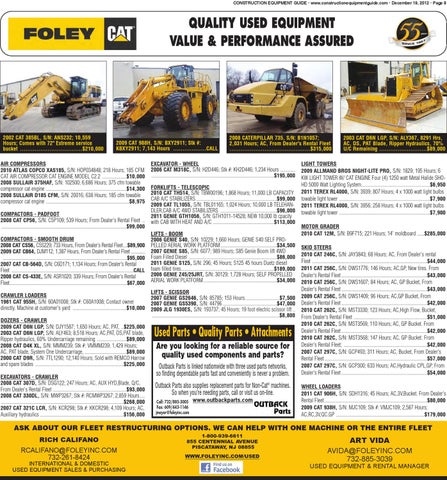 Used Parts • Quality Parts • Attachments Are you looking for a reliable source for quality used components and parts? Outback Parts is linked nationwide with three used parts networks, so finding dependable parts fast and conveniently is never a problem. Outback Parts also supplies replacement parts for Non-Cat® machines. So when you’re needing parts, call or visit us on-line. Call: 732/885-3005 Fax: 609/443-1146 jmeyer@foleyinc.com