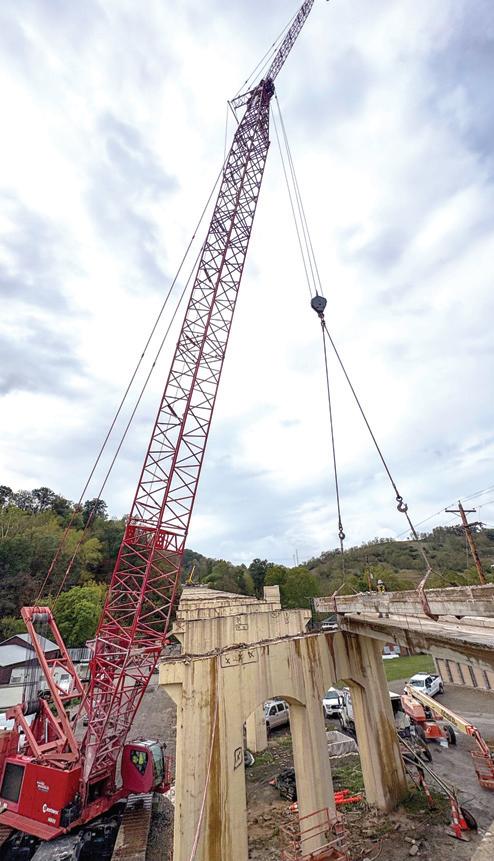 A 200-ton crawler crane tackled long-reach picks beside the 70-ft.-high structure, assisted by 300-ton all-terrain cranes making 160ft. lifts across the creek.