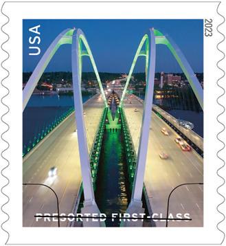 The United States Postal Service (USPS) has shown a spotlight on the architectural design and engineering feats of some of the spectacular bridges that have been connecting people and places across the country for years with the release of four new Presorted First-Class Mail stamps. Ethel Kessler, an art director of USPS, used existing photographs to design these stamps, which include the multispan steel through arch Arrigoni Bridge connecting the Connecticut municipalities of Middletown and Portland; the S-curved cable-stayed Bob Kerrey Pedestrian Bridge between Council Bluffs, Iowa, and Omaha, Neb.; the steel truss Skydance Bridge topped by a public sculpture in Oklahoma City; and the basket-handle twin arch Iowa-Illinois Memorial Bridge connecting Bettendorf, Iowa, and Moline, Ill. The bridges were completed between 1938 and 2022 and chosen for being important landmarks in their communities.