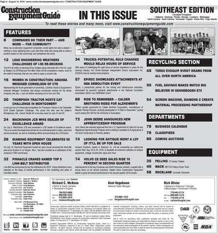 Construction Equipment Guide Southeast Edition (ISSN 1058-6474) is published biweekly by Construction Equipment Guide Ltd. Advertising and Editorial Offices are located at 470 Maryland Dr., Ft. Washington, PA 19034. Toll Free 800/523-2200 or Fax 215/885-2910. Annual Subscription Rate $65.00. Call for Canadian and foreign rates. Periodicals postage paid at Ft. Washington, PA and at additional mailing offices. POSTMASTER: Send address changes to Construction Equipment Guide Southeast Edition, 470 Maryland Dr, Ft. Washington, PA 19034. Contents Copyrighted ©2019, by Construction Equipment Guide, which is a Registered Trademark, registered in the U.S. Patent Office. Registration number 0957323. All rights reserved, nothing may be reprinted or reproduced (including framing) in whole or part without written permission from the publisher. All editorial