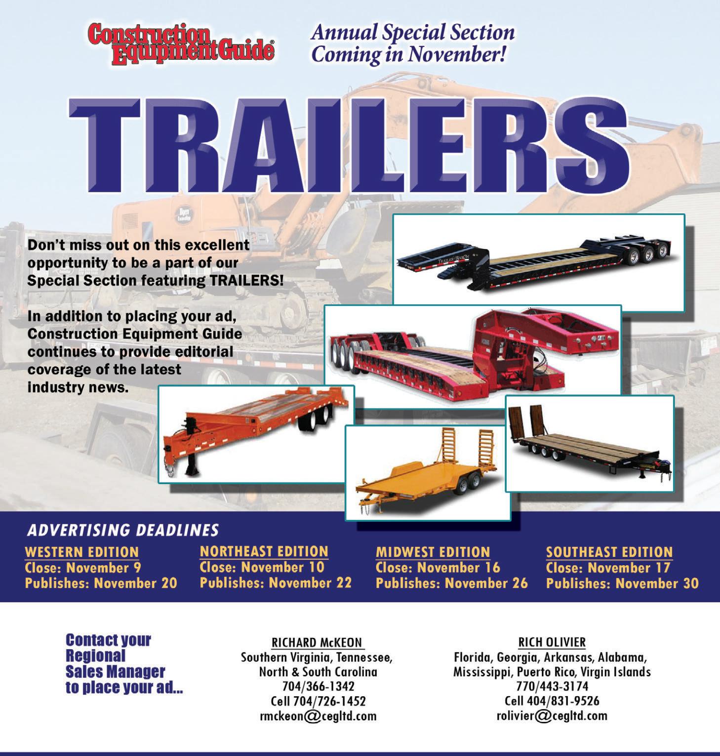 or part without written permission from the publisher. All editorial material, photographs, drawings, letters, and other material will be treated as unconditionally assigned for publication and copyright purposes and are subject to Construction Equipment Guide's unrestricted right to edit and comment editorially. Contributor articles do not necessarily reflect the policy or opinions of this publication. Call or write for advertising rates, publication schedule