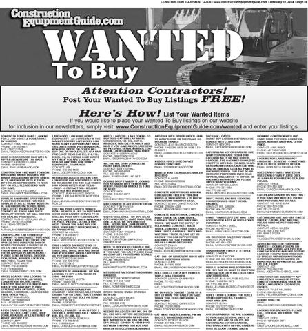 If you would like to place your Wanted To Buy listings on our website for inclusion in our newsletters, simply visit: www.ConstructionEquipmentGuide.com/wanted and enter your listings. SOMERO 30 POWER RAKE | LOOKING FOR A LOW HOUR 3.0 POWER RAKE BY SOMERO CONTACT: TODD VAN DORN PHONE: 319-290-4901 FAX: 319-277-7549 EMAIL:TODDVANDORN@NETZERO.COM –––––––––––––––––––––––––––––––– USED MOTOR GRADER 140G WITH A RIPPER ATTACHED AT THE BACK CONTACT: KPOUSSO KARKA PHONE: 4045459796 EMAIL: PHIKAR1@YAHOO.COM –––––––––––––––––––––––––––––––– CONSTRUCTION | WE WANT TO KNOW WHO OWNS MARSH BUGGIES, USE MARSH BUGGIES AND WE PAY SEVERAL $1, 000 FINDERS FEES IF THEIR INFO HELPS US FIND UNITS TO RENT, BUY OR SELL. PLEASE SEND WHAT YOU HAVE. CONTACT: TYLER PALUMBO EMAIL: PALUMBO519@HOTMAIL.COM –––––––––––––––––––––––––––––––– SURPLUS EQUIPMENT OR OTHER SURPLUS ITEMS REQUIRED | WE NEED SURPLUS ITEMS. I.E HEAVY INDUSTRIAL MACHINERY, FACTORIES, INDUSTRIES, STEEL PRODUCTS. PLEASE CONTACT US IF YOU HAVE SUCH ITEMS, AFTER THAT WE WILL DISCUSS THE DEALING PROCEDURE. CONTACT: RASHID ABDULLAH MALIK PHONE: +92-42-35783964 FAX: +92-42-35783963 EMAIL: ALTECH_ENGINEERS2000@YAHOO.COM –––––––––––––––––––––––––––––––– CATERPILLAR | I AM CURRENTLY LOOKING TO IMMEDIATELY PURCHASE THE FOLLOWING FOR EXPORT: CAT AP1055B OR D SWEEPERS 2000 OR NEWER PNEUMATIC COMPACTOR IR OR CAT 2000 OR NEWER WATER TRUCK 4000GAL 2000 OR NEWER 110TPH ASPHALT PLANT PORTABLE PLEASE SEND PICTURES, DESCRIPTION, SERIAL NUMBER, LOCATION, AND PRICE. THANK YOU! CONTACT: SAM MAIER PHONE: 912-433-9449 FAX: 912-826-0665 EMAIL:SAMMAIER@ICLOUD.COM –––––––––––––––––––––––––––––––– WHEEL LOADER | I AM LOOKING TO BUY USED CATERPILLAR WHEEL LOADERS 920, 930, 936, 938F/G, 950B/C/E/F, 966C/D/E/F/H, 980C/F AND 988B. IF YOU HAVE ANY, PLEASE OFFER ME WITH PICTURES, SERIAL NUMBER, CONDITION, LOCATION AND FINAL OFFER PRICE. CONTACT: AIMN BLBOL PHONE: +971504814823 FAX: +97165355291 EMAIL:INFO@ALWAFAEQUIPMENT.COM –––––––––––––––––––––––––––––––– 8.5X16 CARGO TRAILER USED IN GOOD TO EXCELLENT COND. DROP DOOR, HD AXLES. AT LEAST 6 PICS OF INSIDE, OUTSIDE ETC. CONTACT: JEFF PHONE: 360 584 6882 EMAIL: MARINER322000@YAHOO.COM ––––––––––––––––––––––––––––––––