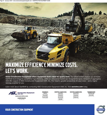 MAXIMIZE EFFICIENCY. MINIMIZE COSTS. LET’S WORK. Volvo Construction Equipment offers equipment that’s ideal for quarry work. Our wheel loaders feature our exclusive OptiShift technology for exceptional fuel efficiency, while our articulated haulers are designed for quick transport of aggregates. With the support of ASC Construction Equipment USA, Inc. The result is greater productivity for your crew – and a higher earning potential for you. Learn more about OptiShift by contacting ASC Construction Equipment USA, Inc. Visit ascvolvo.com today.