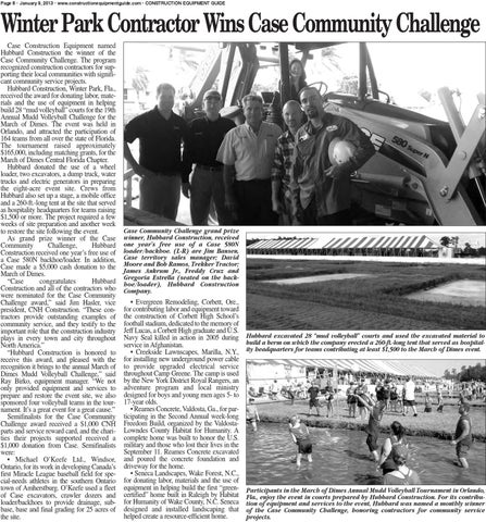 Winter Park Contractor Wins Case Community Challenge Case Construction Equipment named Hubbard Construction the winner of the Case Community Challenge. The program recognized construction contractors for supporting their local communities with significant community service projects. Hubbard Construction, Winter Park, Fla., received the award for donating labor, materials and the use of equipment in helping build 28 “mud volleyball” courts for the 19th Annual Mudd Volleyball Challenge for the March of Dimes. The event was held in Orlando, and attracted the participation of 164 teams from all over the state of Florida. The tournament raised approximately $165,000, including matching grants, for the March of Dimes Central Florida Chapter. Hubbard donated the use of a wheel loader, two excavators, a dump truck, water trucks and electric generators in preparing the eight-acre event site. Crews from Hubbard also set up a stage, a mobile office and a 260-ft.-long tent at the site that served as hospitality headquarters for teams raising $1,500 or more. The project required a few weeks of site preparation and another week to restore the site following the event. As grand prize winner of the Case Community Challenge, Hubbard Construction received one year’s free use of a Case 580N backhoe/loader. In addition, Case made a $5,000 cash donation to the March of Dimes. “Case congratulates Hubbard Construction and all of the contractors who were nominated for the Case Community Challenge award,” said Jim Hasler, vice president, CNH Construction. “These contractors provide outstanding examples of community service, and they testify to the important role that the construction industry plays in every town and city throughout North America.” “Hubbard Construction is honored to receive this award, and pleased with the recognition it brings to the annual March of Dimes Mudd Volleyball Challenge,” said Ray Birko, equipment manager. “We not only provided equipment and services to prepare and restore the event site, we also sponsored four volleyball teams in the tournament. It’s a great event for a great cause.” Semifinalists for the Case Community Challenge award received a $1,000 CNH parts and service reward card, and the charities their projects supported received a $1,000 donation from Case. Semifinalists were: • Michael O’Keefe Ltd., Windsor, Ontario, for its work in developing Canada’s first Miracle League baseball field for special-needs athletes in the southern Ontario town of Amherstburg. O’Keefe used a fleet of Case excavators, crawler dozers and loader/backhoes to provide drainage, subbase, base and final grading for 25 acres of the site.