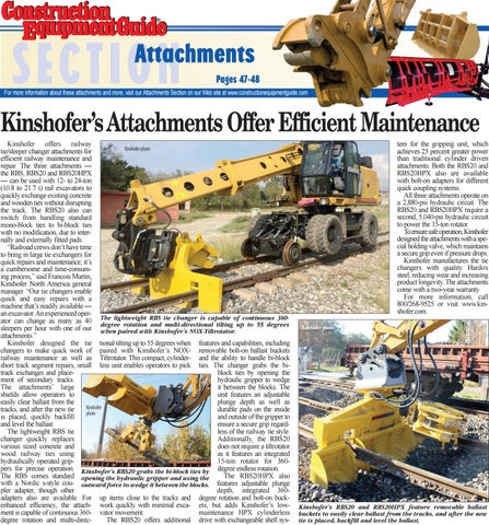 Kinshofer’s Attachments Offer Efficient Maintenance Kinshofer offers railway Kinshofer photo tie/sleeper changer attachments for efficient railway maintenance and repair. The three attachments — the RBS, RBS20 and RBS20HPX — can be used with 12- to 24-ton (10.8 to 21.7 t) rail excavators to quickly exchange existing concrete and wooden ties without disrupting the track. The RBS20 also can switch from handling standard mono-block ties to bi-block ties with no modification, due to internally and externally fitted pads. “Railroad crews don’t have time to bring in large tie exchangers for quick repairs and maintenance; it’s a cumbersome and time-consuming process,” said Francois Martin, Kinshofer North America general manager. “Our tie changers enable quick and easy repairs with a machine that’s readily available — an excavator. An experienced operlightweight RBS tie changer is capable of continuous 360ator can change as many as 40 The degree rotation and multi-directional tilting up to 55 degrees sleepers per hour with one of our when paired with Kinshofer’s NOX-Tiltrotator. attachments.” Kinshofer designed the tie tional tilting up to 55 degrees when features and capabilities, including changers to make quick work of paired with Kinshofer’s NOX- removable bolt-on ballast buckets railway maintenance as well as Tiltrotator. This compact, cylinder- and the ability to handle bi-block short track segment repairs, small less unit enables operators to pick ties. The changer grabs the bitrack exchanges and placeblock ties by opening the ment of secondary tracks. hydraulic gripper to wedge The attachments’ large it between the blocks. The shields allow operators to unit features an adjustable easily clear ballast from the plunge depth as well as Kinshofer tracks, and after the new tie durable pads on the inside photo is placed, quickly backfill and outside of the gripper to and level the ballast. ensure a secure grip regardThe lightweight RBS tie less of the railway tie style. changer quickly replaces Additionally, the RBS20 various sized concrete and does not require a tiltrotator wood railway ties using as it features an integrated hydraulically operated grip15-ton rotator for 360pers for precise operation. Kinshofer’s RBS20 grabs the bi-block ties by degree endless rotation. The RBS comes standard opening the hydraulic gripper and using the The RBS20HPX also with a Nordic s-style cou- outward force to wedge it between the blocks. features adjustable plunge pler adapter, though other depth, integrated 360adapters also are available. For up items close to the tracks and degree rotation and bolt-on buckenhanced efficiency, the attach- work quickly with minimal exca- ets, but adds Kinshofer’s lowment is capable of continuous 360- vator movement. maintenance HPX cylinderless degree rotation and multi-direcThe RBS20 offers additional drive with exchangeable shell sys-
