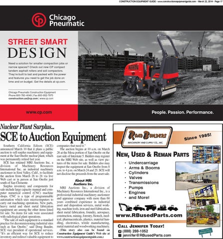 companies that need it.” The auction begins at 10 a.m. on March 26 at the Mesa portion of San Onofre on the east side of Interstate 5. Bidders may register on the MRI Web site, as well as view pictures of the items for sale. Bidders also may inspect the equipment at San Onofre from 8 a.m. to 4 p.m. on March 24 and 25. SCE will not disclose the proceeds from the asset sale. About MRI Auctions Inc. MRI Auctions Inc., a division of Machinery Resources International Inc., is a professional industrial machinery auctioneer and appraiser company with more than 60 years combined experience in industrial asset and disposition services, metal working, machine tools, iron and steel fabrication, sheet metal fabrication, foundry, aerospace, construction, mining, forestry, biotech, medical, pharmaceuticals, plastics, material handling, electronics, textile manufacturing, metal material and woodworking machinery. (This story also can be found on Construction Equipment Guide’s Web site at www.constructionequipmentguide.com.)