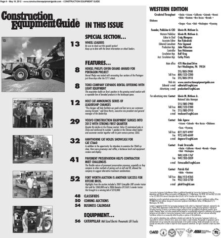 Construction Equipment Guide Western Edition is published bi-weekly by Construction Equipment Guide Ltd. Advertising and Editorial Offices are located at 470 Maryland Dr., Ft. Washington, PA 19034. Toll Free 800/523-2200 or Fax 215/885-2910. Annual Subscription Rate $65.00. Call for Canadian and foreign rates. Application to mail at periodicals postage prices is pending at Ft. Washington, PA and at additional mailing offices. POSTMASTER: Send address changes to Construction Equipment Guide Western Edition, 470 Maryland Dr, Ft. Washington, PA 19034. Contents Copyrighted ©2012, by Construction Equipment Guide, which is a Registered Trademark, registered in the U.S. Patent Office. Registration number 0957323. All rights reserved, nothing may be reprinted or reproduced (including framing) in whole or part without written permission from the publisher. All editorial material, photographs, drawings, letters, and other material will be treated as unconditionally assigned for publication and copyright purposes and are subject to Construction Equipment Guide's unrestricted right to edit and comment editorially. Contributor articles do not necessarily reflect the policy or opinions of this publication. Call or write for advertising rates, publication schedule and media kit. The Construction Equipment Guide is not responsible for clerical or printer's errors, every care is taken to avoid mistakes. Photographs of equipment used in advertisements are not necessarily actual photographs of the specific machine. Similar photographs are used occasionally and every effort is taken to depict the actual equipment advertised. The right is reserved to reject any advertising.