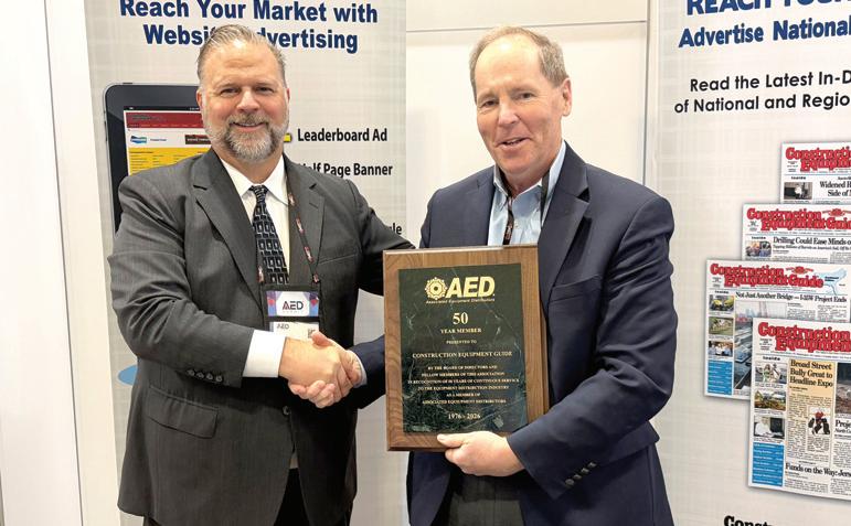 During the AED Summit/CONDEX event held Jan. 19-21, 2026, in Dallas Texas, the association’s board of directors and fellow members honored Construction Equipment Guide (CEG) with an award commemorating 50 years of continuous membership. Ted McKeon (R), president of Construction Equipment Guide, accepts the award from Jon Cruthers (L), senior vice president, market and business development, Associated Equipment Distributors (AED). CEG is celebrating its 68th year in business in 2026.