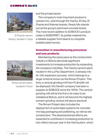 and the private sector. The company’s most important product is cement mix, sold through the Viacha, Emisa, El Puente and Warnes brands. Ready Mix stands out as the group’s premixed concrete brand. The most recent addition to SOBOCE’s product roster is SOBOPRET, its prefab material line, a reliable supplier from beams to complete prefabricated homes. Innovation in manufacturing processes and new products Maintaining the same pace as the construction industry in Bolivia demands significant investments to increase production by expanding the company’s facilities. The Viacha cement plant, located in the La Paz Department, is already into its 12th expansion process, which belongs to a larger scheme known as the Illimani Project. This time, a vertical grinding mill from FLSmidth will be deployed; this Danish company has been a supplier to SOBOCE since the 1970s. The vertical grinding mill will be the first in its class to be installed at Bolivia, and it will become the highest cement-grinding vertical mill above sea level. The Illimani Project also includes the deployment of automated systems for concrete mix bag packaging and palletizing, as well as silo construction. The aforementioned efforts are expected to contribute in increasing production to two million tons per year in the Viacha plant, which