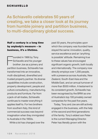 past 50 years, the principles upon which the company was founded have stayed the same: innovation, quality, service excellence and an ‘anything is possible’ attitude. Remaining true to these values has encouraged significant organic growth, both locally and internationally. The company now directly employs over 1,200 people, with a presence across Australia, New Zealand, South-East Asia and the Middle East, and an annual turnover of more than $550 million. A testament to its consistent growth, Schiavello has been recognised by the BRW as one of Australia’s top 100 privately owned companies for the past five years. Today, Tony and Joe are still actively engaged in the business, with the help of the second and third generations of the family. Tony’s eldest son Peter is the current Managing Director. Peter has literally grown with the