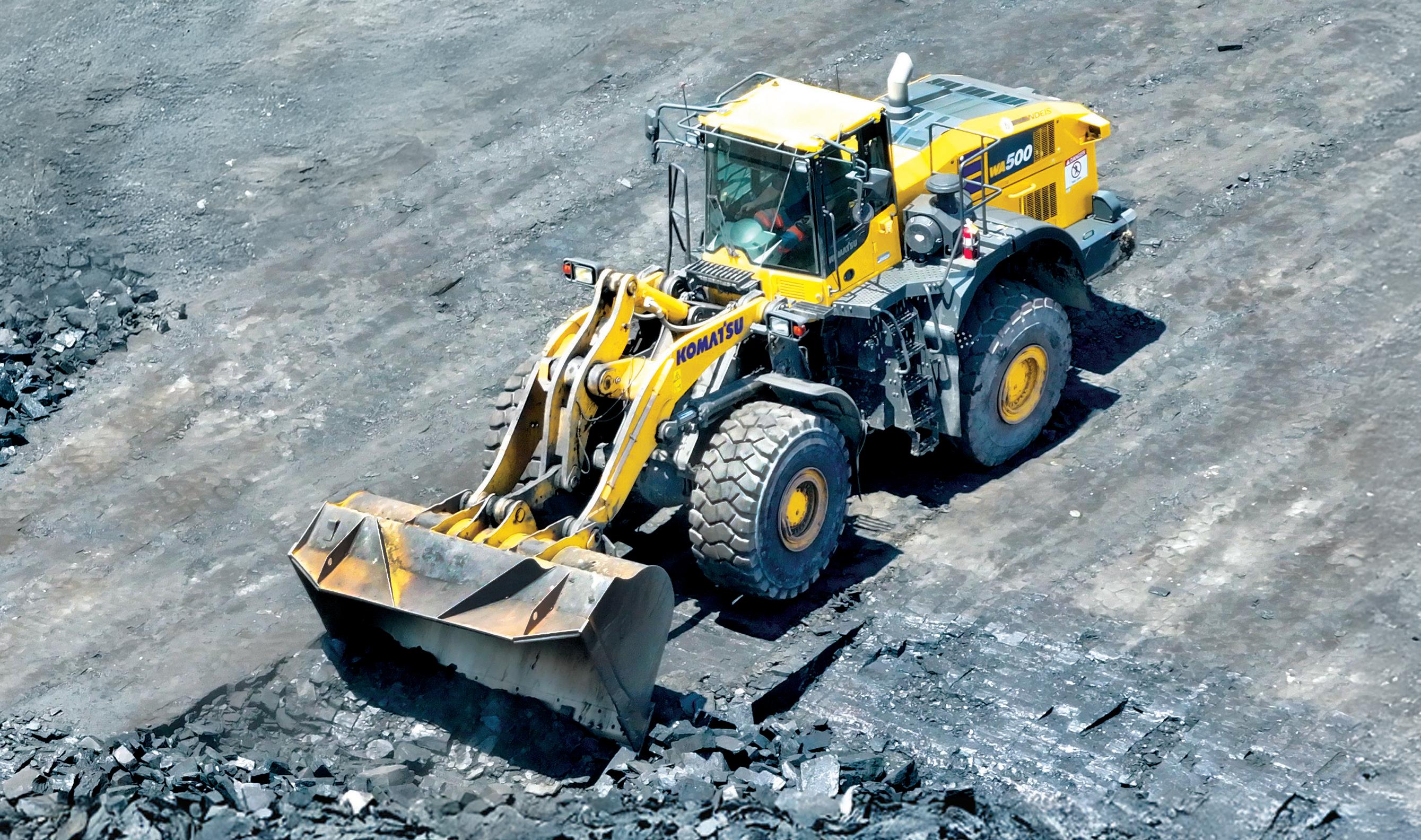 An operator pushes a pile of coal with a Komatsu WA500 wheel loader.