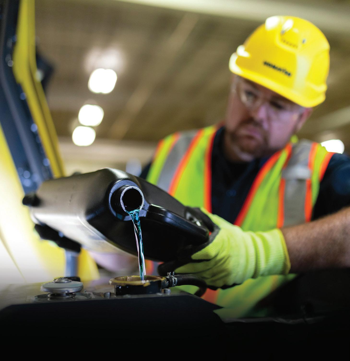 Komatsu Supercoolant is available in 1-gallon jugs, 5-gallon pails, 55-gallon drums and 320-gallon totes through your Komatsu distributor and on My Komatsu. Consult your machine’s operator and maintenance manual (OMM) or distributor representative for the proper fluid level. ■