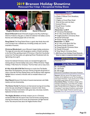 • Home Pickup & Return • 6 Meals: 3 Deluxe Cont. Breakfasts, 3 Dinners • 3 Nights at Grand Plaza Hotel • Wine & Dine with the Stars • St James Winery • Russell Stover Candies • 5 Top Shows: November 4, 2019 * Christmas Wonderland * #1 Hits of the 60s & 50s Too * Hughes Brothers Christmas Show * Daniel O’Donnell * Dutton Family Christmas November 11, 2019 * #1 Hits of the 60s & 50s Too * Dutton Family Christmas * Doug Gabriel’s Christmas Show * Daniel O’Donnell * Shoji Tabuchi Christmas Show